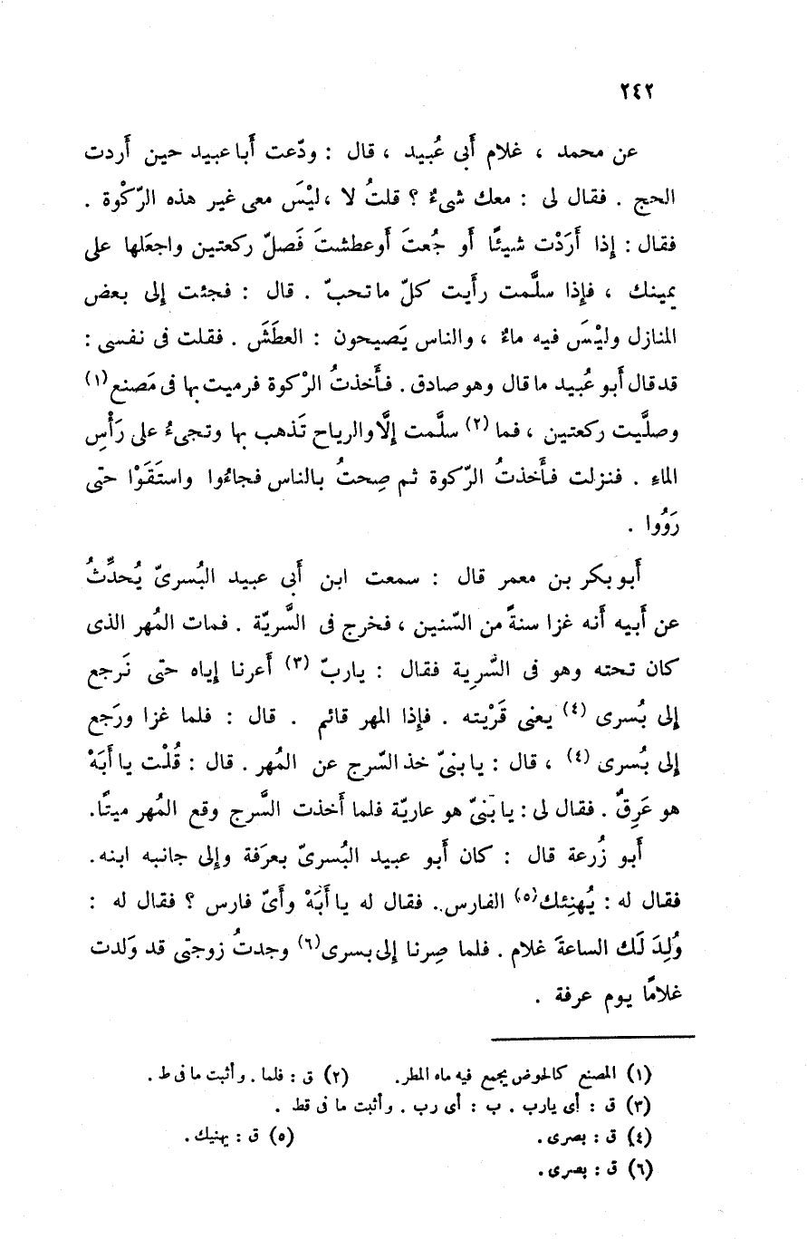 عن محمد غلام أبي عبيد قال ودعت أبا عبيد حين أردت الحج فقال لي معك شيء قلت لا ليس معي غير هذه الركوة فقال إذا أردت شيئا أو جعت أو عطشت فصل ركعتين واجعلها على يمينك فإذا سلمت رأيت كل ما تحب قال فجئت إلى بعض المنازل و ليس فيه ماء و الناس يصيحون العطش فقلت في نفسي قد قال أبو عبيد ما قال و هو صادق فأخذت الركوة فرميت بها في مصنع وصليت ركعتين فما سلمت إلا والرياح تذهب بها و تجيء على رأس الماء فنزلت فأخذت الركوة ثم صحت بالناس فجاءوا واستقوا حتى رووا