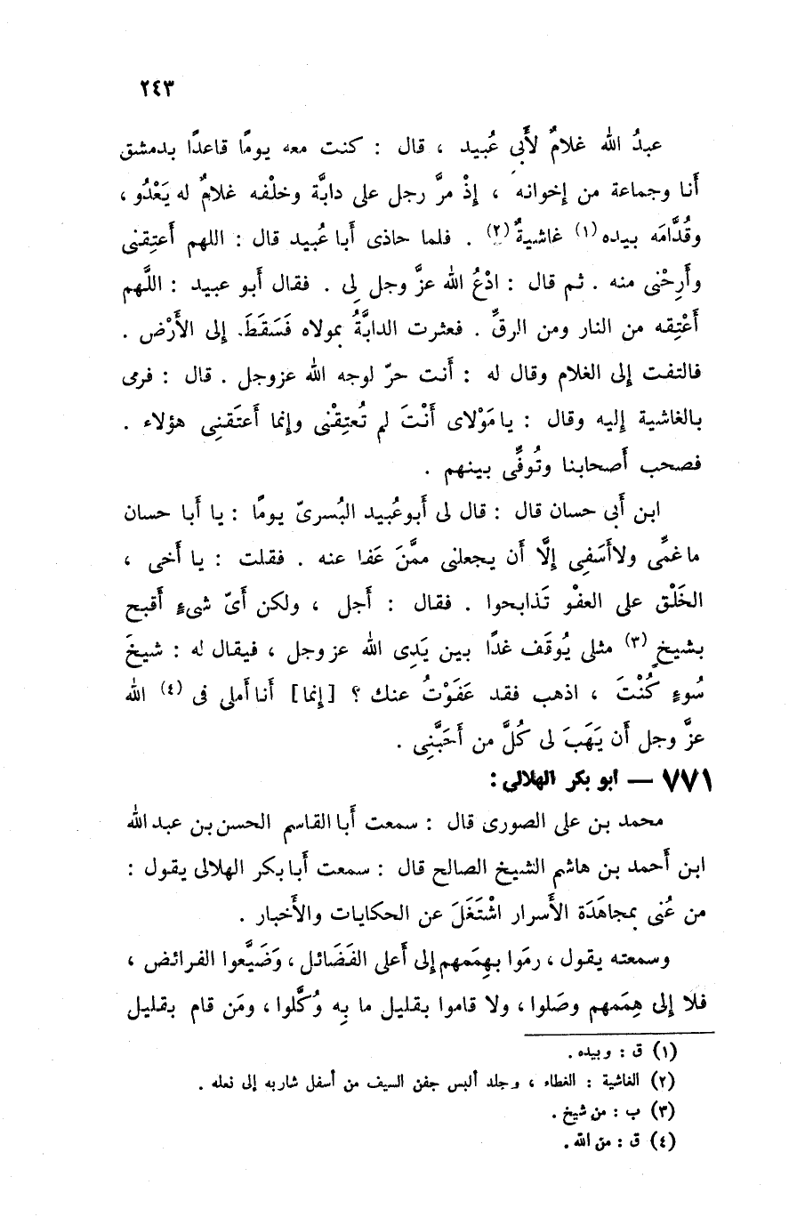 محمد بن علي الصوري قال سمعت أبا القاسم الحسن بن عبد الله ابن أحمد بن هاشم الشيخ الصالح قال سمعت أبا بكر الهلالي يقول من عني بمجاهدة الأسرار اشتغل عن الحكايات والأخبار