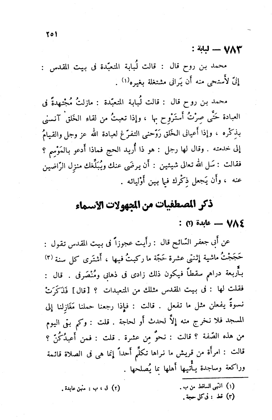 عنأبي جعفر السائح قال رأيت عجوزا في بيت المقدس تقول حججت ماشية إثنتي عشرة حجة ما ركبت فيها أشتري كل سنة بأربعة دراهم سقطا فيكون ذلك زادي في ذهابي ومنصرفي قال فقلت لها في بيت المقدس مثلك من المتعبدات قال فذكرت نسوة يفعلن مثل ما تفعل قالت فإذا رجعنا حملنا مغازلنا إلى المسجد فلا نخرج منه إلا لحدث أو لحاجة قلت وكم بقي اليوم من هذه الصفة قالت نحو من عشرة قلت فمن أعبدكن قالت امرأة من قريش ما نراها تكلم أحدا إنما هي في الصلاة قائمة وراكعة و ساجدة يأتيها أهلها بما يصلحها