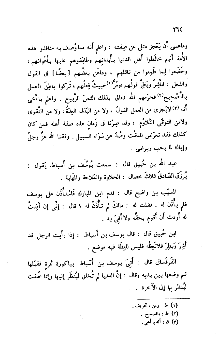 وما عسى أن يعجز مثلى عن صفته واعلم أنه مما وصف به منافقو هذه الأمة أنهم خالطوا أهل الدنيا بأبدانهم و طابقوهم عليها بأهوائهم و خضعوا لما طمعوا من نائلهم و داهن بعضهم بعضا في القول والفعلوالفعل فأشر و بطر قولهم ومر خبيث فعلهم تركوا باطن العمل بالتصحيح فحرمهم الله تعالى بذلك الثمن الربيح واعلم ياأخي أنه لا يجزي من العمل القول ولامن البذل العدة ولا من التقوى و لامن التوقى التلاوم وقد صرنا في زمان هذه صفة أهله فمن كان كذلك فقد تعرض للمقت وصد عن سواء السبيل وفقنا الله عزوجل وإياك لما يحب و يرضى
