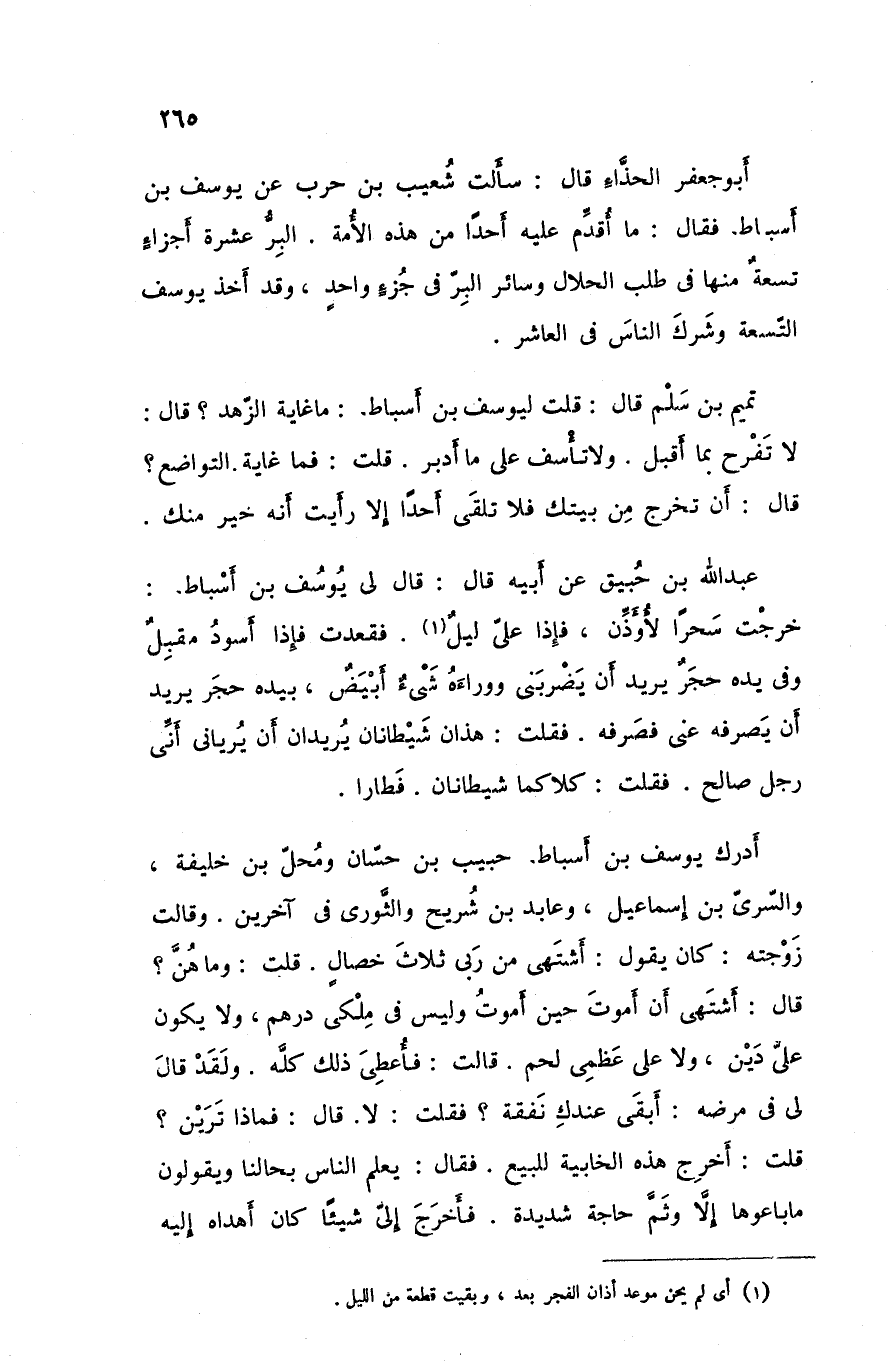 أبو جعفر الحذاء قالسألت شعيب بن حرب عن يوسف بن أسباط فقال ما أقدم عليه أحدا من هذه الأمة البر عشرة أجزاء تسعة منها في طلب الحلال وسائر البر في جزء واحد وقد أخذ يوسف التسعة وشرك الناس في العاشر