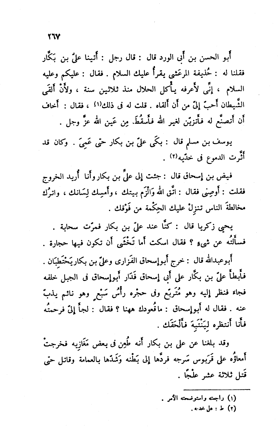 أبو الحسن بن أبي الورد قال قال رجل أتينا علي بن بكار فقلنا له حذيفة المرعشي يقرأ عليك السلام فقال عليكم و عليه السلام إني لأعرفه يأكل الحلال منذ ثلاثين سنة ولأن ألقى الشيطان أحب إلي منأن ألقاه قلت له في ذلك فقال أخاف أن أتصنع له فأتزين لغير الله فأسقط من عين الله عزوجل