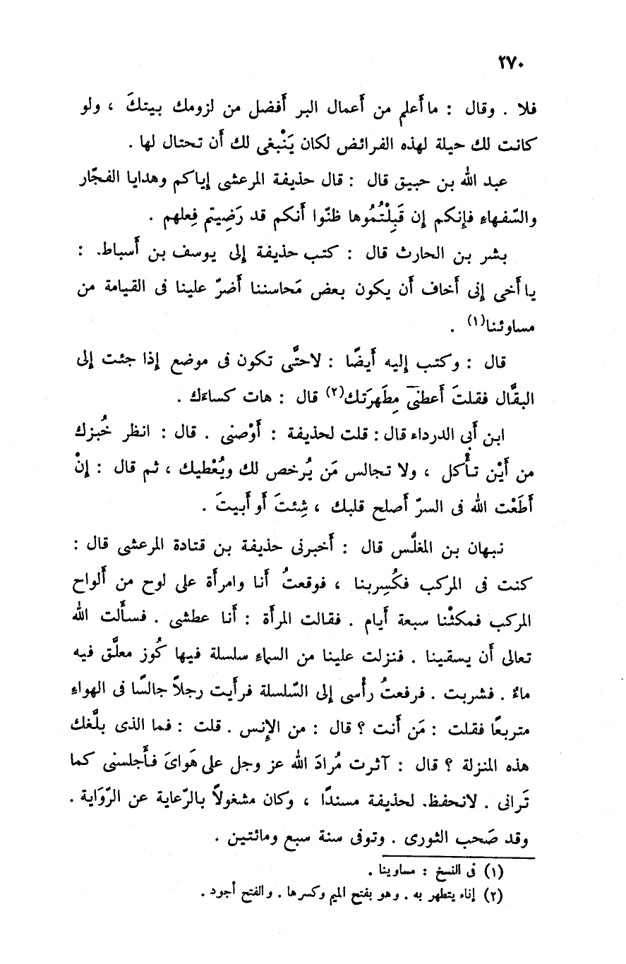 نبهان بن المغلس قال أخبرني حذيفة بن قتادة المرعشي قال كنت في المركب فكسر بنا فوقعت أنا وامرأة على لوح من ألواح المركب فمكثنا سبعة أيام فقالت المرأة أنا عطشى فسألت الله تعالى أن يسقينا فنزلت علينا من السماء سلسلة فيها كوز معلق فيه ماء فشربت فرفعت رأسي إلى السلسلة فرأيت رجلا جالسا في الهواء متربعا فقلت من أنت قال من الإنس قلت فماالذي بلغك هذه المنزلة قال آثرت مراد الله عزوجل على هواي فأجلسني كما تراني لا نحفظ لحذيفة مسندا وكان مشغولا بالرعاية عن الرواية وقد صحب الثوري وتوفي سنة سبع و مائتين