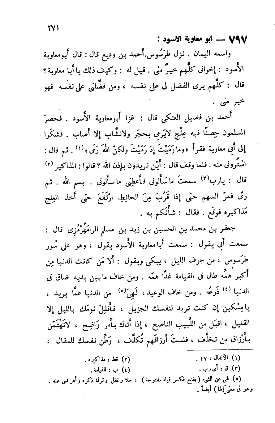 أحمد بن فضيل العتكي قال غزا أبو معاوية الأسود فحصر المسلمون حصنا فيه علج لا يرمي بحجر ولا نشاب إلا أصاب فشكوا إلى أبي معاوية فقرأ وما رميت إذ رميت ولكن الله رمى ثم قال استروني منه فلما وقف قال أين تريدون بإذن الله قالوا المذاكير قال يا رب سمعت ما سألوني فأعطني ما سألوني بسم الله ثم رمى فمر السهم حتى إذا قرب من الحائط ارتفع حتى أخذ العلج مذاكيره فوقع فقال شأنكم به