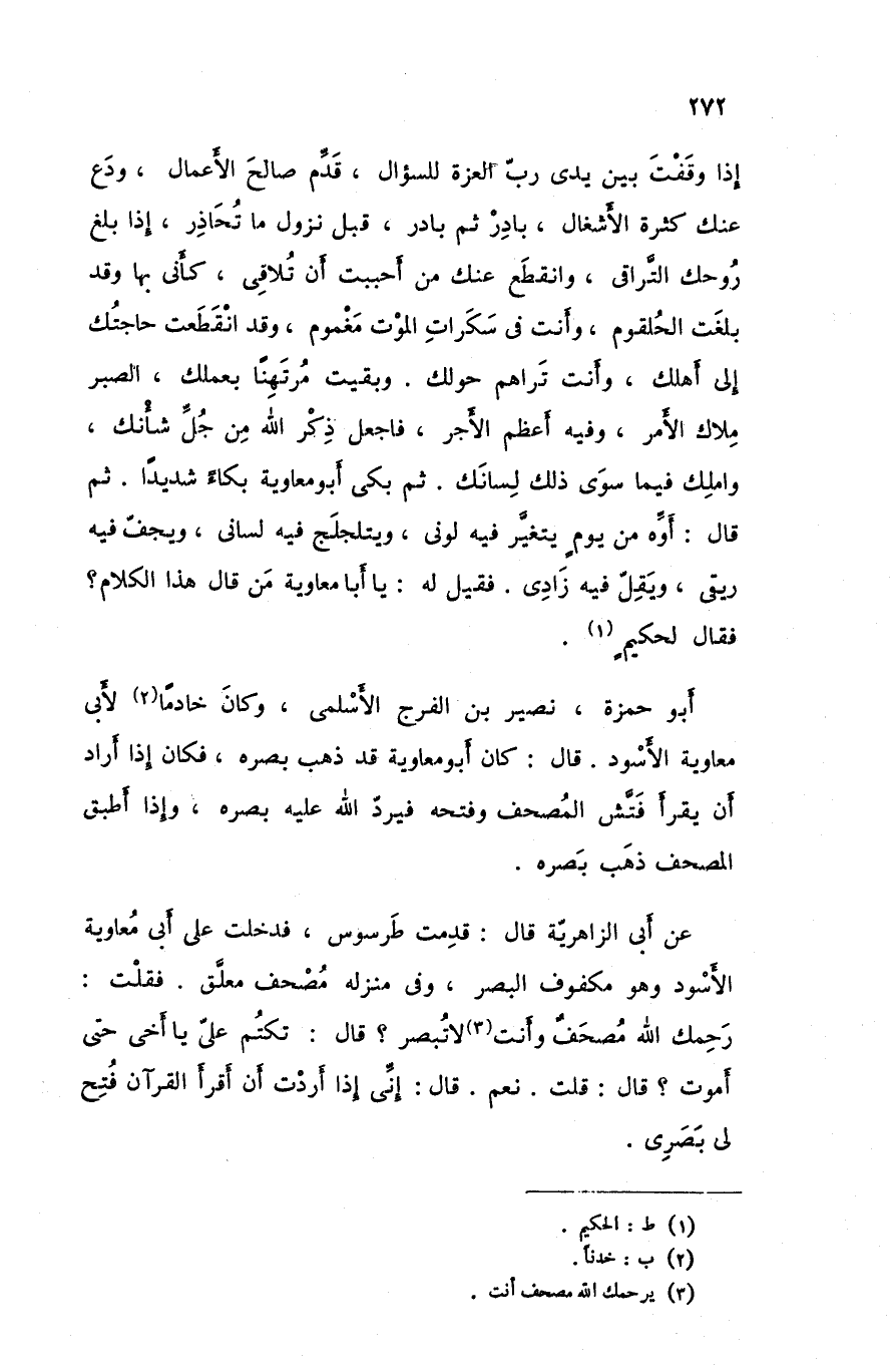 إذا وقفت بين يدي العزة للسؤال قدم صالح الأعمال ودع عنك كثرة الأشغال بادر ثم بادر قبل نزول ما تحاذر إذا بلغ روحك التراقي وانقطع عنك من أحببت أن تلاقي كأني بها وقد بلغت الحلقوم وأنت في سكرات الموت مغموم وقد انقطعت حاجتك إلى أهلك و أنت تراهم حولك و بقيت مرتهنا بعملك الصبر ملاك الأمر و فيه أعظم الأجر فاجعل ذكر الله من جل شأنك واملك فيما سوى ذلك لسانك ثم بكى أبو معاوية بكاء شديدا ثم قال أوه من يوم يتغير فيه لوني و يتلجلج فيه لساني و يجف فيه ابقي ويقل فيه زادي فقيل له يا أبا معاوية من قال هذا الكلام فقال لحكيم