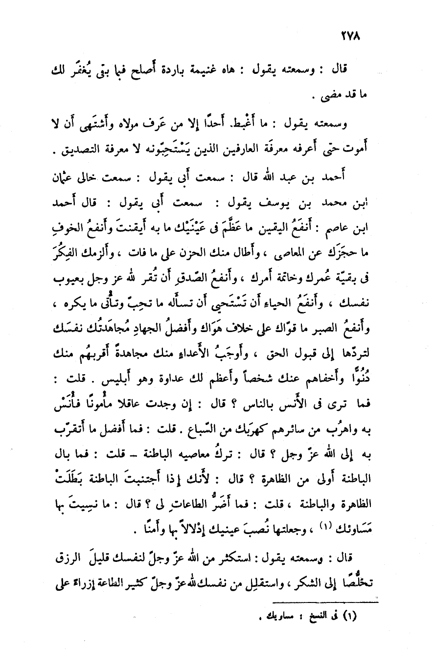 أحمد بن عبد الله قال سمعت أبي يقول سمعت خالي عثمان ابن محمد بن يوسف يقول سمعت أبي يقول قال أحمد ابن عاصم أنفع اليقين ما عظم في عينيك ما به أيقنت وأنفع الخوف ما حجزك عن المعاصي وأطال منك الحزن على ما فات وألزمك الفكر في بقية عمرك و خاتمة أمرك وأنفع الصدق أن تقر لله عزوجل بعيوب نفسك وأنفع الحياء أن تستحيي أن تسأله ما تحب و تأتي ما يكره وأنفع الصبر ما قواك على خلاف هواك وأفضل الجهاد مجاهدتك نفسك لتردها إلى قبول الحق وأوجب الأعداء منك مجاهدة أقربهم منك دنوا وأخفاهم عنك شخصا وأعظم لك عداوة وهو إبليس قلت فما ترى في الأنس بالناس قال إن وجدت عاقلا مأمونا فأنس به واهرب من سائرهم كهربك من السباع قلت فما أفضل ما أتقرب به إلى الله عزوجل قال ترك معاصيه الباطنة قلت فما بال الباطنة أولى من الظاهرة قال لأنك إذا اجتنبت الباطنة بطلت الظاهرة والباطنة قلت فما أضر الطاعات لي قال ما نسيت بها مساوئك و جعلتها نصب عينيك إدلالا بها وأمنا