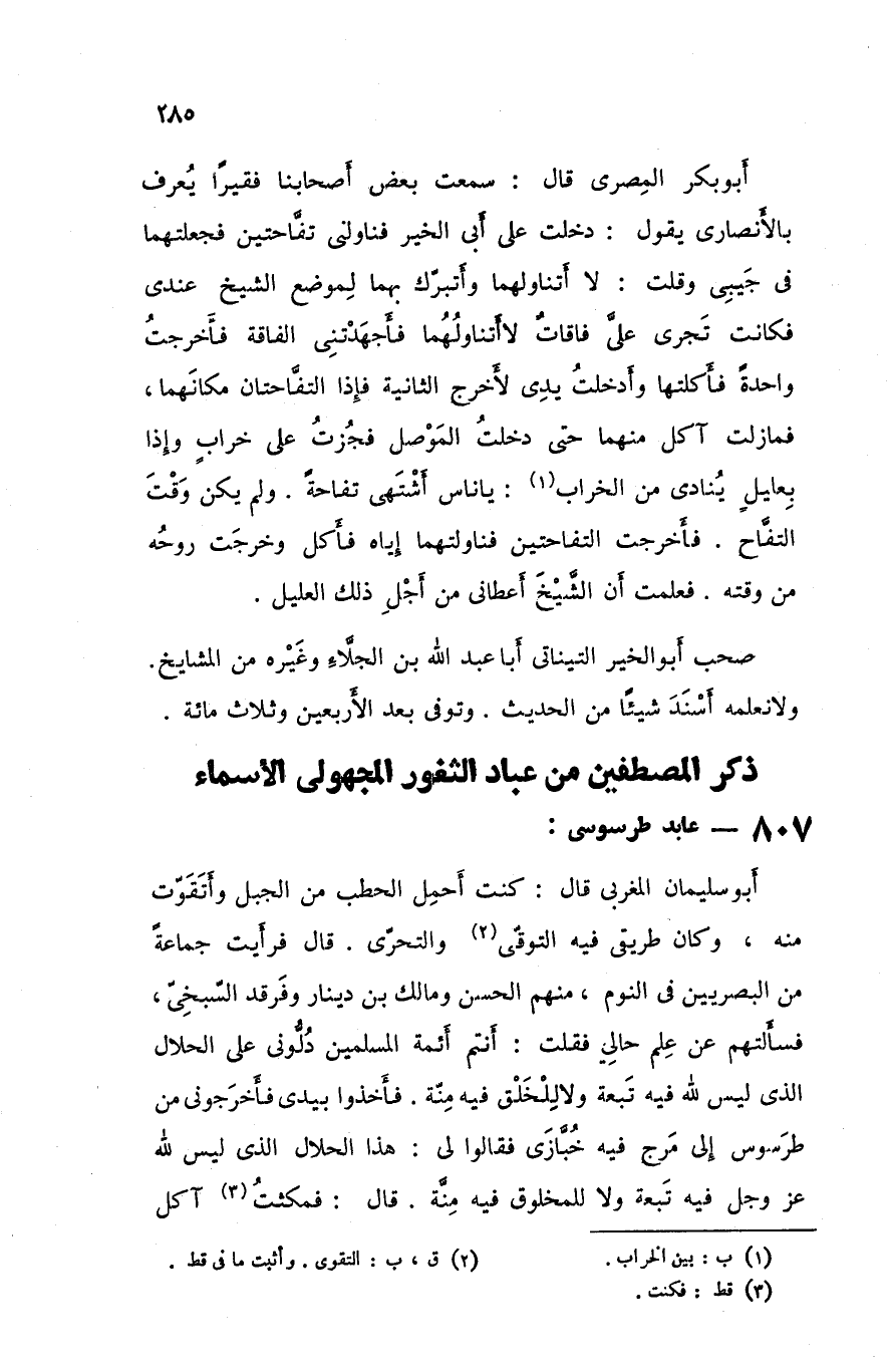 أبو سليمان المغربي قال كنت أحمل الحطب من الجبل و أتقوت منه و كان طريقي فيه التوقي والتحري قال فرأيت جماعة من البصريين في النوم منهم الحسن و مالك بن دينار و فرقد السبخي فسألتهم عن علم حالي فقلت أنتم أئمة المسلمين دلوني على الحلال الذي ليس لله فيه تبعة ولا للخلق فيه منة فأخذوا بيدي فأخرجني من طرسوس إلى مرج فيه خبازي فقالوا لي هذا الحلال الذي ليس لله عزوجل فيه تبعة ولا للمخلوق فيه منة قال فمكثت آكل