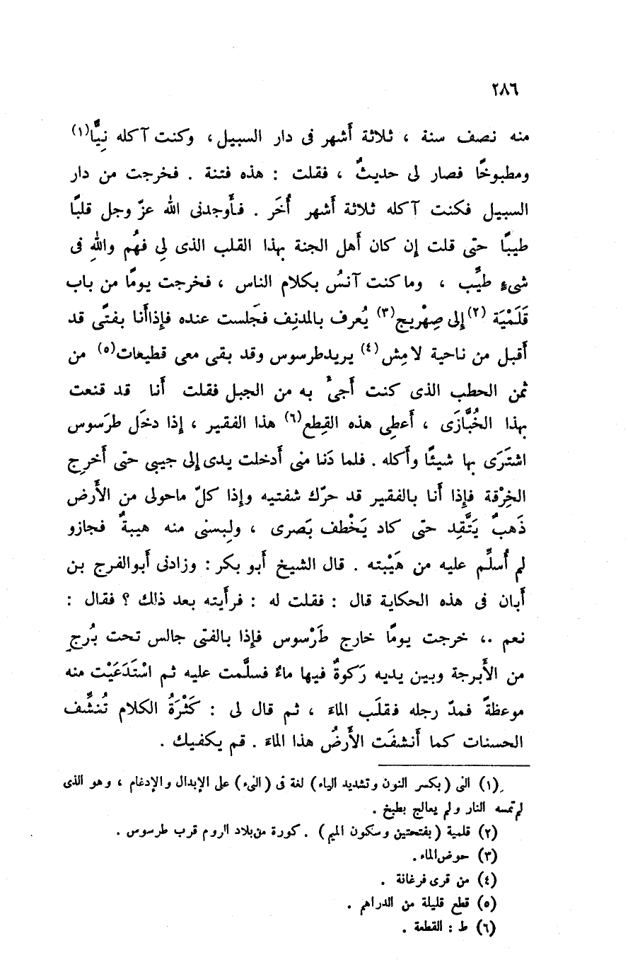 منه نصف سنة ثلاثة أشهر في دار السبيل و كنت آكله نيا و مطبوخا فصار لي حديث فقلت هذه فتنة فخرجت من دار السبيل فكنت آكله ثلاثة أشهر أخر فأوجدني الله عزوجل قلبا طيبا حتى قلت إن كان أهل الجنة بهذا القلب الذي لي فهم والله في شيء طيب وما كنت آنس بكلام الناس فخرجت يوما من باب قلميه إلى صهريج يعرف بالمدنف فجلست عنده فإذا أنا بفتى قد أقبل من ناحية لامش يريد طرسوس وقد بقي معي قطيعات من ثمن الحطب الذي كنت أجيء به من الجبل فقلت أنا قد قنعت بها الخبازي أعطى هذه القطع هذا الفقير إذا دخل طرسوس اشترى بها شيئا و أكله فلما دنا مني أدخلت يدي إلى جيبي حتى أخرج الخرقة فإذا أنا بالفقير قد حرك شفتيه وإذا كل ما حولىمن الأرض ذهب يتقد حتى كاد يخطف بصري و لبسني منه هيبة فجاوز لم أسلم عليه من هيبته قال الشيخ أبو بكر وزادنيأبو الفرج بن أبان في هذه الحكاية قال فقلت له فرأيته بعد ذلك فقال نعم خرجت يوما خارج طرسوس فإذا بالفتى جالس تحت برج من الأبرجة و بين يديه ركوة فيها ماء فسلمت عليه ثم استدعيت منه موعظة فمد رجله فقلب الماء ثم قال لي كثرة الكلام تنشف الحسنات كما أنشفت الأرض هذا الماء قم يكفيك