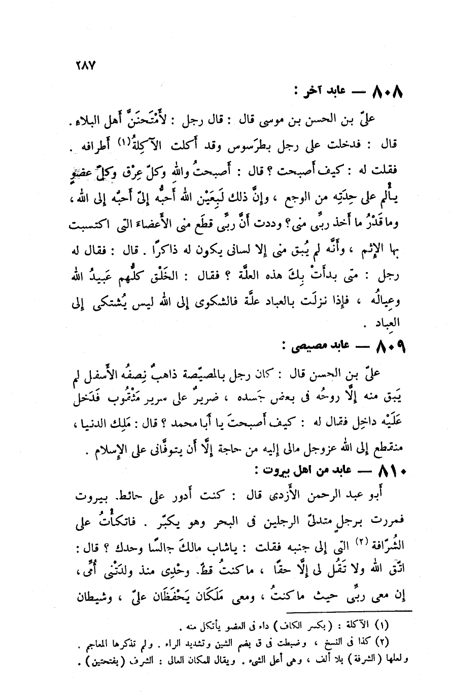 علي بن الحسن قال كان رجل بالمصيصة ذاهب نصفه الأسفل لم يبق منه إلا روحه في بعض جسده ضرير على سرير مثقوب فدخل عليه داخل فقال له كيف أصبحت يا أبا محمد قال ملك الدنيا منقطع إلى الله عزوجل مالي إليه من حاجة إلا أن يتوفاني على الإسلام