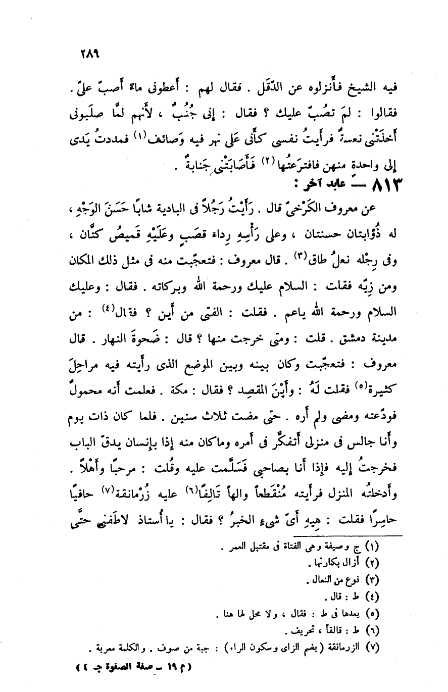 عن معروف الكرخي قال رأيت رجلا في البادية شابا حسن الوجه له ذؤابتان حسنتان وعلى رأسه رداء قصب وعليه قميص كتان وفي رجله نعل طاق قال معروف فتعجبت منه في مثل ذلك المكان ومن زيه فقلت السلام عليك ورحمة الله وبركاته فقال وعليك السلام ورحمة الله يا عم فقلت الفتى من أين فقال من مدينة دمشق قلت ومتى خرجت منها قال ضحوة النهار قال معروف فتعجبت وكان بينه و بين الموضع الذي رأيته فيه مراحل كثيرة فقلت له و أين المقصد فقال مكة فعلمت أنه محمول فودعته ومضى ولم أره حتى مضت ثلاث سنين فلما كان ذات يوم وأنا جالس في منزلي أتفكر في أمره وما كان منه إذا بإنسان يدق الباب فخرجت إليه فإذا أنا بصاحبي فسلمت عليه وقلت مرحبا وأهلا وأدخلته المنزل فرأيته منقطعا والها تالفا عليه زرمانقة حافيا حاسرا فقلت هيه أي شيء الخبر فقال ياأستاذ لاطفني حتى