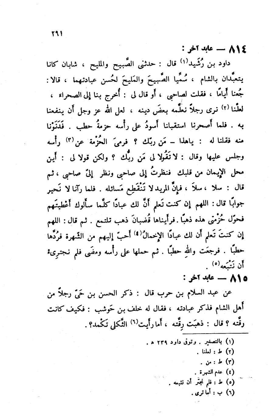 داود بن رشيد قال حدثني الصبيح والمليح شابان كانا يتعبدان بالشام سميا الصبيح والميلح لحسن عبادتهما قالا جعنا أياما فقلت لصاحبي أو قال لي أخرج بنا إلى الصحراء لعلنا نرى رجلا نعلمه بعض دينه لعل الله عزوجل أن ينفعنا به فلما أصحرنا استقبلنا أسود على رأسه حزمة حطب فدنونا منه فقلنا له ياهذا من ربك فرمى الحزمة عن رأسه و جلس عليها و قال لا تقولا لي من ربك و لكن قولا لي أين محل الإيمان من قلبك فنظرت إلى صاحبي ونظر إلي صاحبي ثم قال سلا سلا فإن المريد لا تنقطع مسائله فلما رآنا لا نحير جوابا قال اللهم إن كنت تعلم أن لك عبادا كلما سألوك أعطيتهم فحول حزمتي هذه ذهبا فرأيناها قضبان ذهب تلتمع ثم قال اللهم إن كنت تعلم أن لك عبادا الإخمال أحب إليهم من الشهرة فردها حطبا فرجعت والله حطبا ثم حملها على رأسه ومضى فلم نجترئ أن نتبعه
