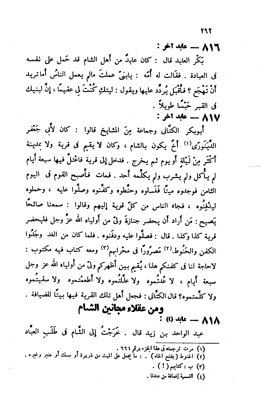 أبو بكر الكتاني و جماعة من المشايخ قالوا كان لأبي جعفر الدينوري أخ يكون بالشام و كان لا يقيم في قرية و لا بمدينة أكثر من ليلة أو يوم ثم يخرج فدخل إلى قرية فاعتل فيها سبعة أيام لم يأكل و لم يشرب و لم يكلمه أحد فمات فأصبح القوم في اليوم الثامن فوجدوه ميتا فغسلوه و حنطوه و كفنوه و صلوا عليه و حملوه ليدفنوه فجاء الناس من كل قرية إليهم وقالوا سمعنا صائحا يصيح من أراد أن يحضر جنازة ولي من أولياء الله عزوجل فليحضر قرية كذا وكذا قال فصلوا عليه ودفنوه فلما كان من الغد وجدوا الكفن و الحنوط مصرورا في محرابهم ومعه كتاب فيه مكتوب لا حاجة لنا في كفنكم هذا يقيم بين أظهركم ولي من أولياء الله عزوجل سبعة أيام لا عدتموه ولا عللتموه ولا أطعمتموه ولا سقيتموه ولا كلمتموه قال الكتاني فجعل أهل تلك القرية فيها بيتا للضيافة ومن عقلاء مجانين الشام