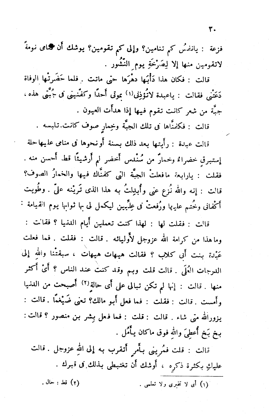 قالت فقلت لها لهذا كنت تعملين أيام الدنيا فقالت وما هذا من كرامة الله عزوجل لأوليائه قالت فقلت فما فعلت عبدة بنت أبي كلاب فقالت هيهات هيهات سبقتنا والله إلى الدرجات العلى قالت قلت وبم وقد كنت عند الناس أي اكثر منها قالت إنها لم تكن تبالي على أي حالة اصبحت من الدنيا وامست قالت فقلت فما فعل أبو مالك تعني ضيغما قالت يزور الله متى شاء قالت قلت فما فعل بشر بن منصور قالت بخ بخ أعطي والله فوق ما كان يأمل