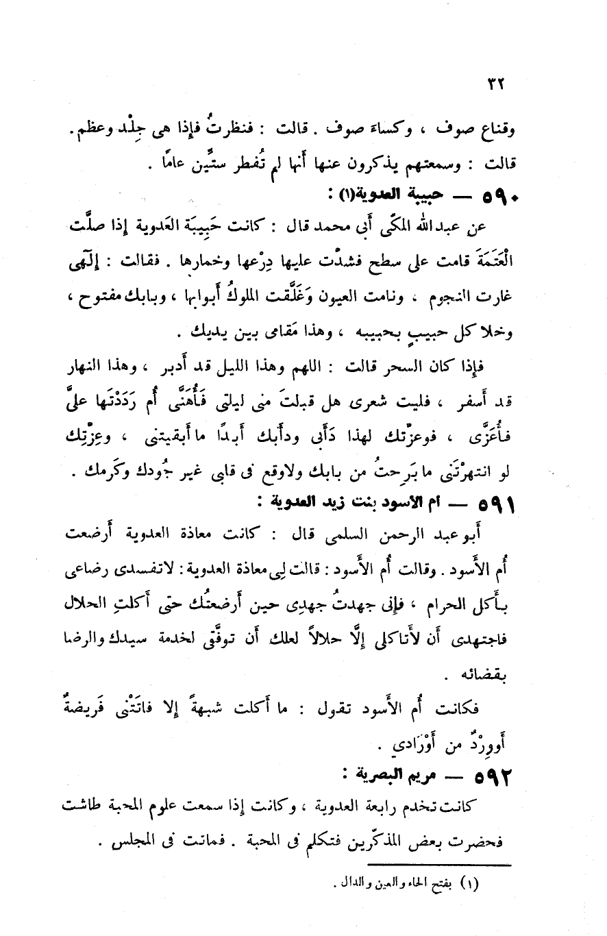 عن عبد الله المكي ابي محمد قال كانت حبيبة العدوية إذا صلت العتمة قامت على سطح فشدت عليها درعها وخمارها فقالت إلهي غارت النجوم ونامت العيون وغلقت الملوك أبوابها وبابك مفتوح وخلا كل حبيب بحبيبه وهذا مقامي بين يديك فإذا كان السحر قالت اللهم وهذا الليل قد أدبر وهذا النهار قد أسفر فليت شعري هل قبلت مني ليلتي فأهني أم رددتها علي فأعزى فوعزتك لهذا دأبي ودأبك أبدا ما أبقيتني وعزتك لو انتهزتني ما برحت من بابك ولا وقع في قلبي غير جودك وكرمك 591 أم الأسود بنت زيد العدوية
