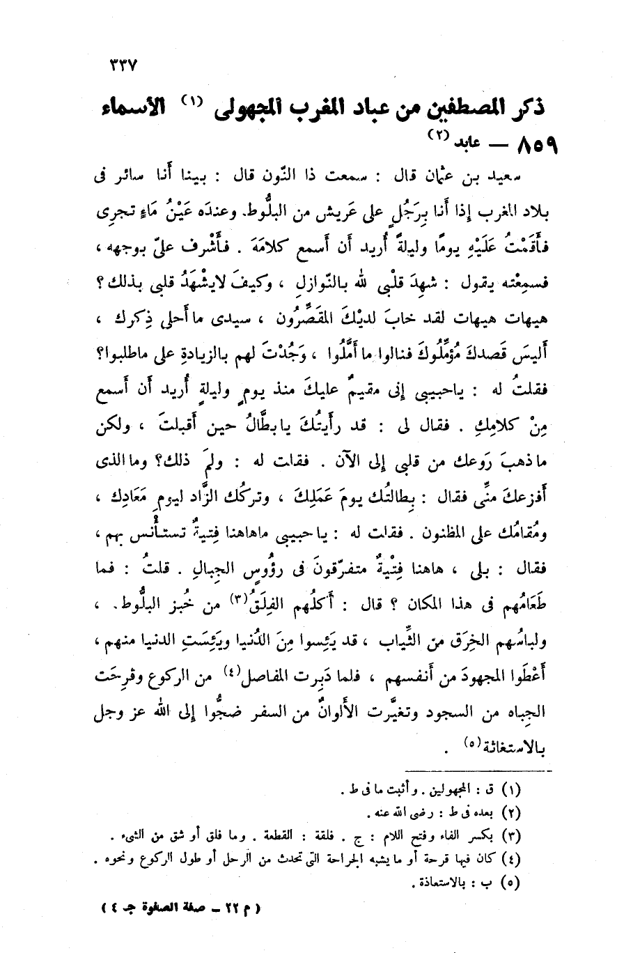 سعيد بن عثمان قال سمعت ذا النون قال بينا أنا سائر في بلاد المغرب إذا أنا برجل على عريش من البلوط وعنده عين ماء تجري فأقمت عليه يوما وليله أريد أن أسمع كلامه فأشرف علي بوجهه فسمعته يقول شهد قلبي لله بالنوازل وكيف لا يشهد قلبي بذلك هيهات هيهات قد خاب لديك المقصرون سيدي ما أحلى ذكرك أليس قصدك مؤملوك فنالوا ما أملوا وجدت لهم بالزيادة على ماطلبوا فقلت له يا حبيبي إني مقيم عليك منذ يوم و ليلة أريد أن أسمع من كلامك فقال لي قد رأيتك يا بطال حين أقبلت ولكن ما ذهب روعك من قلبي إلى الآن فقلت له و لم ذلك وماالذي أفزعك مني فقال بطالتك يوم عملك و تركك الزاد ليوم معادك ومقامك على المظنون فقلت له يا حبيبي ما هاهنا فتية تستأنس بهم فقال بلى ها هنا فتية متفرقون في رؤوس الجبال قلت فما طعامهم طعامهم في هذا المكان قال أكلهم الفلق من خبز البلوط ولباسهم الخرق من الثياب قد يئسوا من الدنيا ويئست الدنيا منهم أعطوا المجهود من أنفسهم فلما دبرت المفاصل من الركوع و قرحت الجباه من السجود وتغيرت الألوان من السفر ضجوا إلى الله عزوجل بالاستغاثة