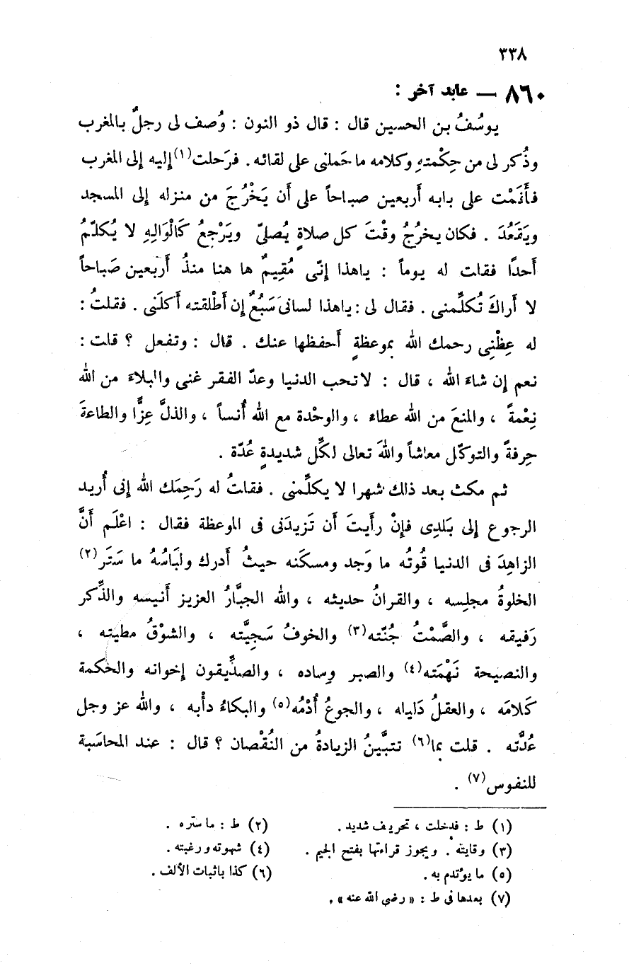 يوسف بن الحسين قال قال ذو النون وصف لي رجل بالمغرب وذكر لي من حكمته و كلامه ما حملني على لقائه فرحلت إليه إلى المغرب فأقمت على بابه أربعين صباحا على أن يخرج من منزله إلى المسجد ويقعد فكان يخرج وقت كل صلاة يصلي و يرجع كالواله لا يكلم أحدا فقلت له يوما يا هذا إني مقيم ها هنا منذ أربعين صباحا لا أراك تكلمني فقال لي يا هذا لساني سبع إن أطلقته أكلني فقلت له عظني رحمك الله بموعظة أحفظها عنك قال وتفعل قلت نعم إن شاء الله قال لا تحب الدنيا و عد الفقر غنى و البلاء من الله نعمة والمنع من الله عطاء والوحدة مع الله أنسا والذل عزا والطاعة حرفة و التوكل معاشا والله تعالى لكل شديدة عدة