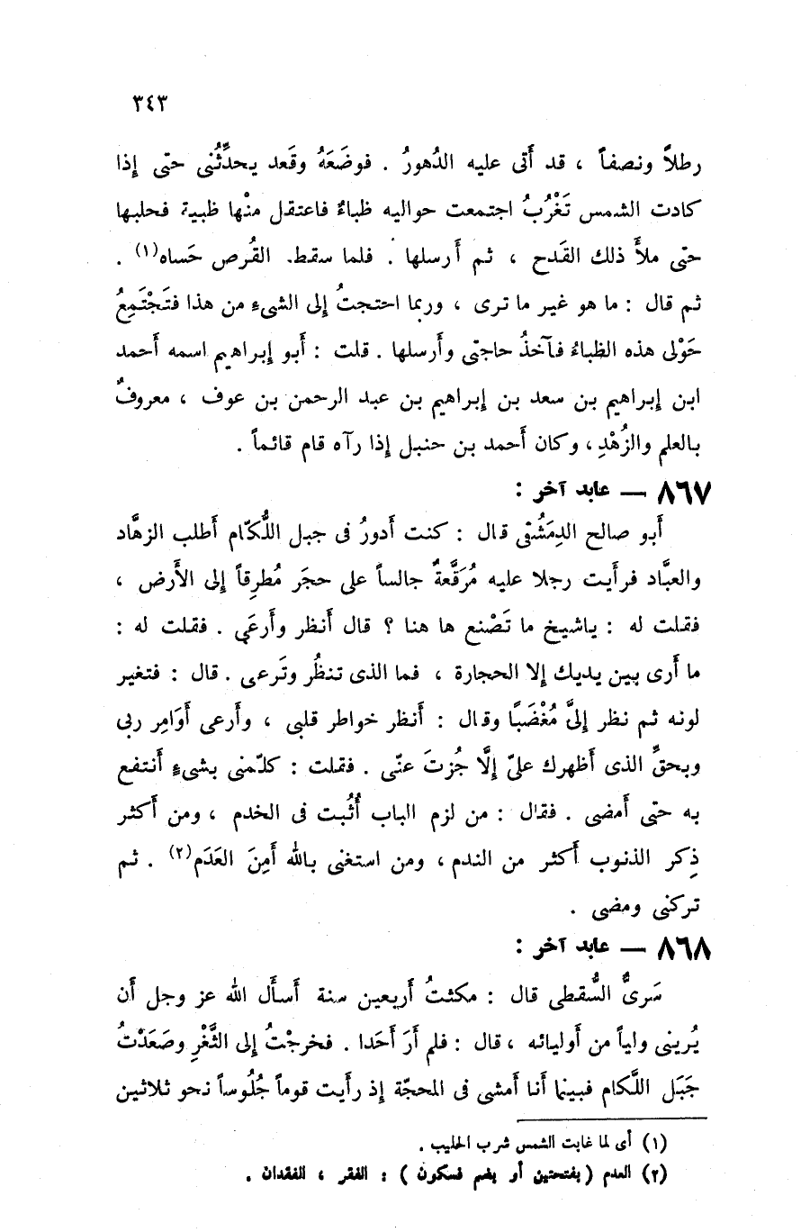 رطلا ونصفا قد أتى عليه الدهور فوضعه وقعد يحدثني حتى إذا كادت الشمس تغرب اجتمعت حواليه ظباء فاعتقل منها ظبية فحلبها حتى ملأ ذلك القدح ثم أرسلها فلما سقط القرص حساه ثم قال ما هو غير ما ترى وربما احتجت إلى الشيء من هذا فتجتمع حولي هذه الظباء فآخذ حاجتي وأرسلها قلت أبو إبراهيم اسمه أحمد ابن إبراهيم بن سعد بن إبراهيم بن عبد الرحمن بن عوف معروف بالعلم والزهد وكان أحمد بن حنبل إذا رآه قام قائما