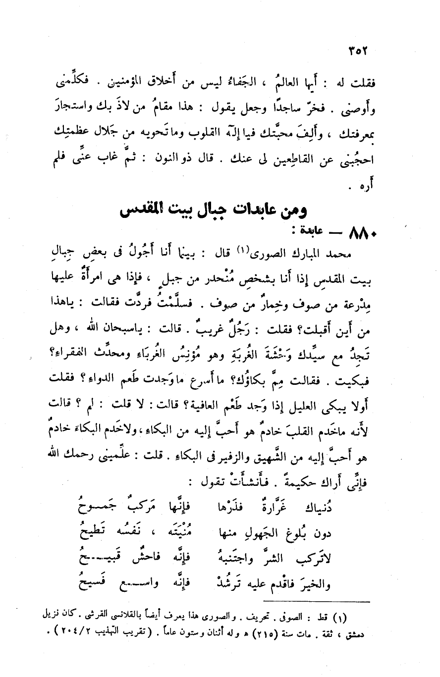 محمد المبارك الصوري قال بينما أنا أجول في بعض جبال بيت المقدس إذا أنا بشخص منحدر من جبل فإذا هي امرأة عليها مدرعة من صوف و خمار من صوف فسلمت فردت فقالت يا هذا من أين أقبلت فقلت رجل غريب قالت يا سبحان الله وهل تجد مع سيدك وحشة الغربة وهو مؤنس الغرباء ومحدث الفقراء فبكيت فقالت مم بكاؤك ما أسرع ما وجدت طعم الدواء فقلت أولا يبكي العليل إذا وجد طعم العافية قالت لا قلت لم قالت لأنه ما خدم القلب خادم هو أحب إليه من البكاء و لا خدم البكاء خادم هو أحب إليه من الشهيق والزفير في البكاء قلت علميني رحمك الله فإني أراك حكيمة فأنشأت تقول