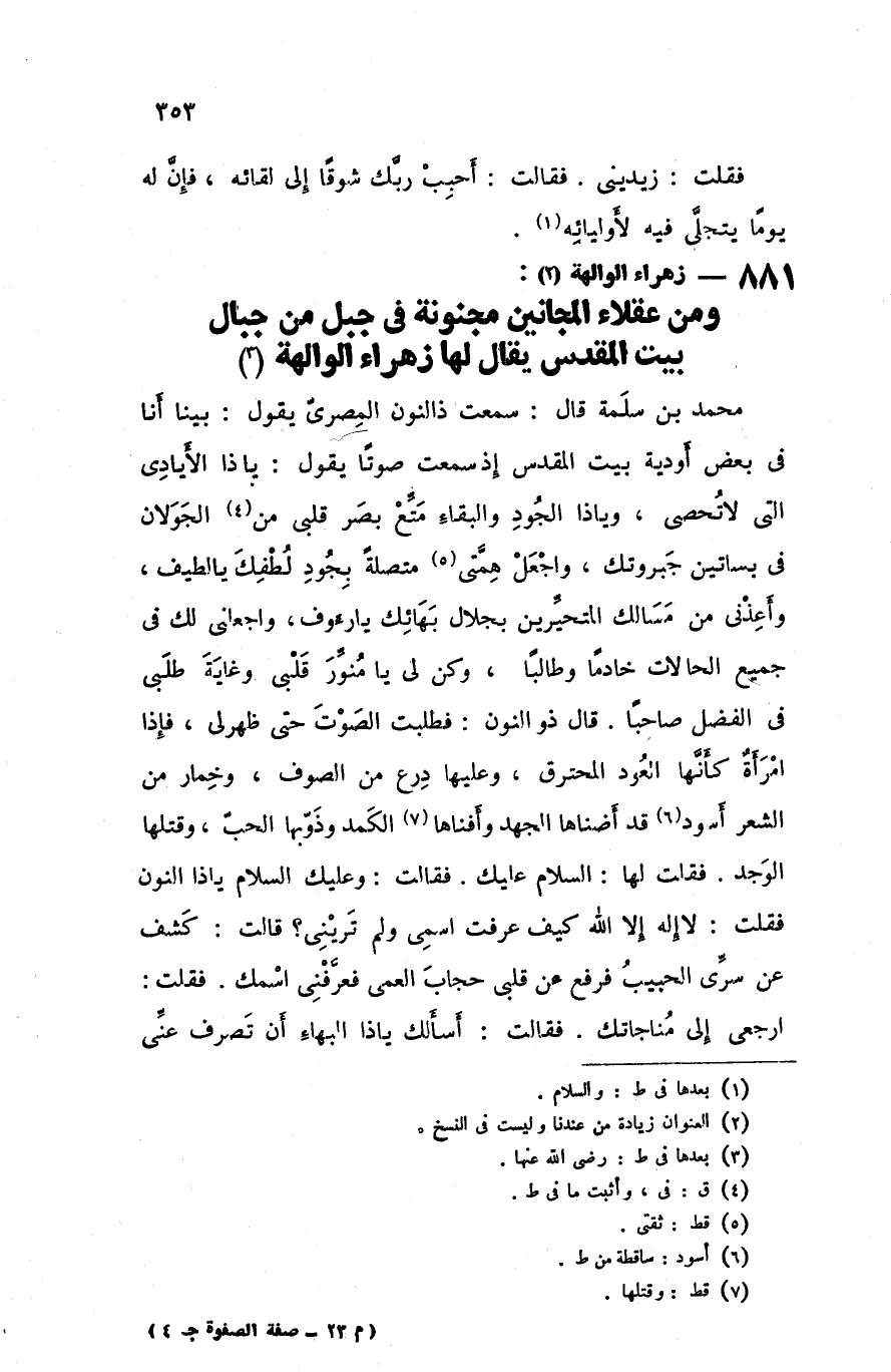 881 - زهراء الوالهة ومن عقلاء المجانين مجنونة في جبل من جبال بيت المقدس يقال لها زهراء الوالهة