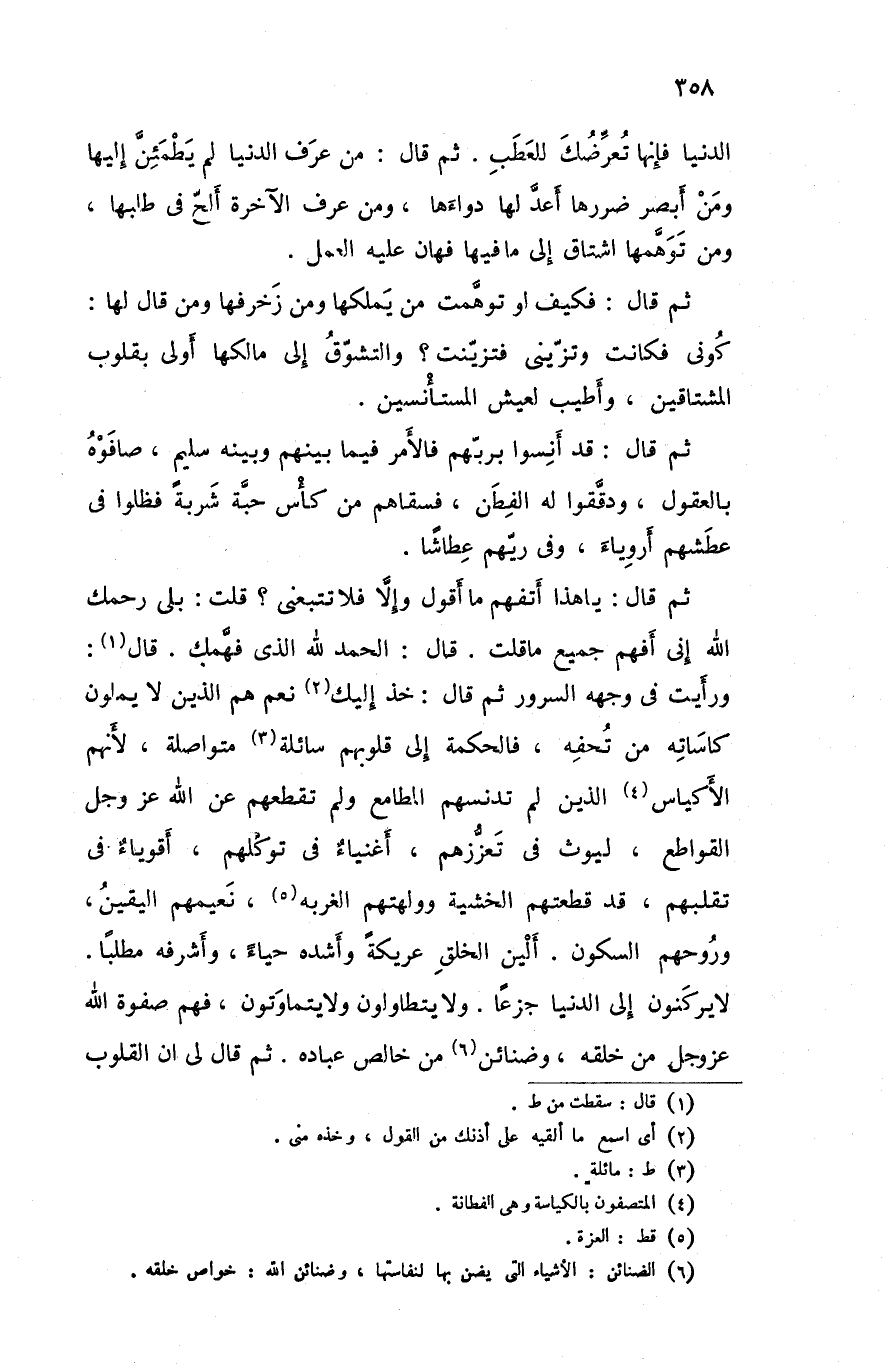 ثم قال يا هذا أتفهم ما أقول وإلا فلا تتبعني قلت بلى رحمك الله إني أفهم جميع ما قلت قال الحمد لله الذي فهمك قال ورأيت في وجهه السرور ثم قال خذ إليك نعم هم الذين لا يملون كاساته من تحفه فالحكمة إلى قلوبهم سائلة متواصلة لأنهم الأكياس الذين لم تدنسهم المطامع ولم تقطعهم عن الله عزوجل القواطع ليوث في تعززهم أغنياء في توكلهم أقوياء في تقلبهم قد قطعتهم الخشية وولهتهم الغربة نعيمهم اليقين وروحهم السكون ألين الخلق عريكة وأشده حياء وأشرفه مطلبا لا يركنون إلى الدنيا جزعا ولا يتطاولون ولا يتماوتون فهم صفوة الله عزوجل من خلقه و ضنائن من خالص عباده ثم قال لي أن القلوب