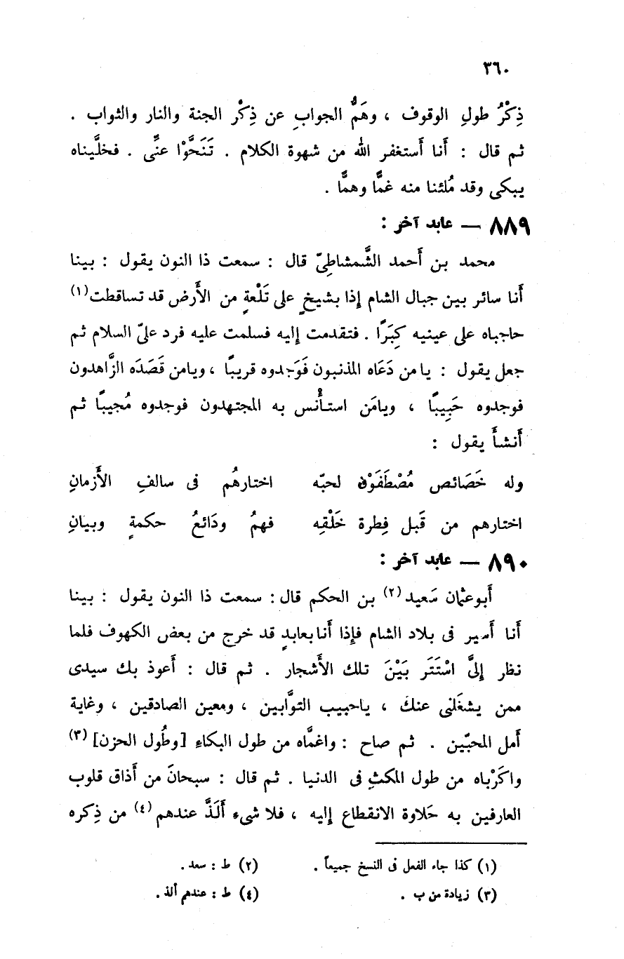 أبو عثمان سعيد بن الحكم قال سمعت ذا النون يقول بينا أنا أسير في بلاد الشام فإذا أنا بعابد قد خرج من بعض الكهوف فلما نظر إلي استتر بين تلك الأشجار ثم قال أعوذ بك سيدي ممن يشغلني عنك يا حبيب التوابين ومعين الصادقين و غاية أمل المحبين ثم صاح واغماه من طول البكاء و طول الحزن واكرباه من طول المكث في الدنيا ثم قال سبحان من أذاق قلوب العارفين به حلاوة الانقطاع إليه فلا شيء ألذ عندهم من ذكره