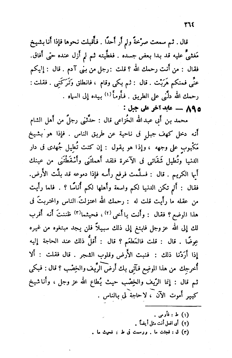 قال ثم سمعت صرخة ولم أر أحدا فأقبلت نحوها فإذا أنا بشيخ مغشي عليه قد بدا بعض جسده فغطيته ثم لم أزل عنده حتى أفاق فقال من أنت رحمك الله قلت رجل من بني آدم قال إليكم عني فمنكم هربت قال ثم بكى و قام فانطلق وتركني فقلت رحمك الله دلني على الطريق فأومأ بيده إلىالسماء