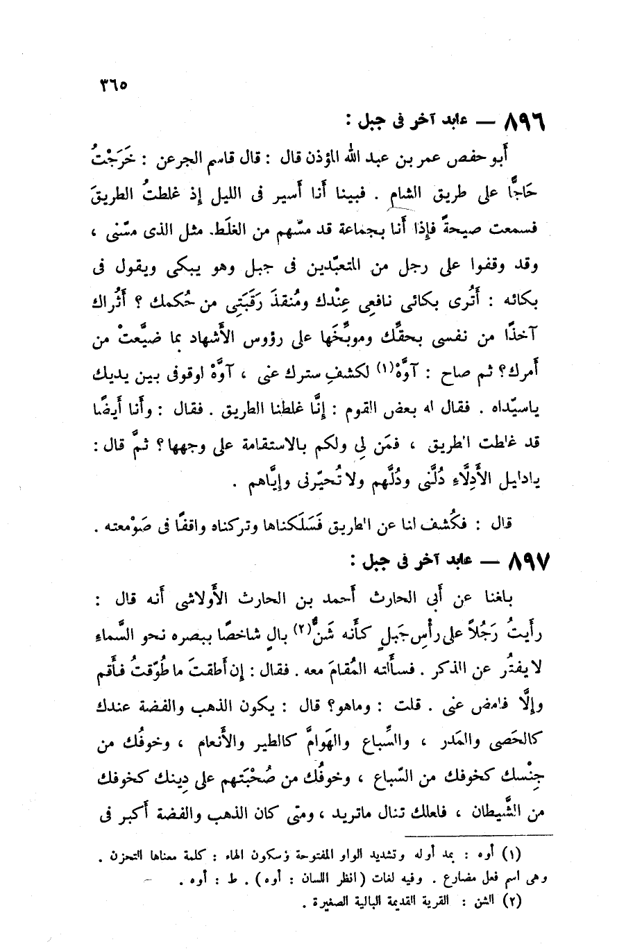 أبو حفص عمر بن عبد الله المؤذن قال قال قاسم الجرعن عن خرجت حاجا على طريق الشام فبينا أنا أسير في الليل إذ غلطت الطريق فسمعت صيحة فإذا أنا بجماعة قد مسهم من الغلط مثل الذي مسني وقد وقفوا على رجل من المتعبدين في جبل وهو يبكي و يقول في بكائه أترى بكائي نافعي عندك ومنقذ رقبتي من حكمك أتراك آخذا من نفسي بحقك وموبخها على رؤوس الأشهاد بما ضيعت من أمرك ثم صاح آوه لكشف سترك عني آوه لوقوفي بين يديك يا سيداه فقال له بعض القوم إنا غلطنا الطريق فقال وأنا أيضا قد غلطت الطريق فمن لي ولكم بالاستقامة على وجهها ثم قال يا دليل الأدلاء دلني ودلهم ولاتحيرني وإياهم قال فكشف لنا عن الطريق فسلكناها وتركناها وافقا في صومعته