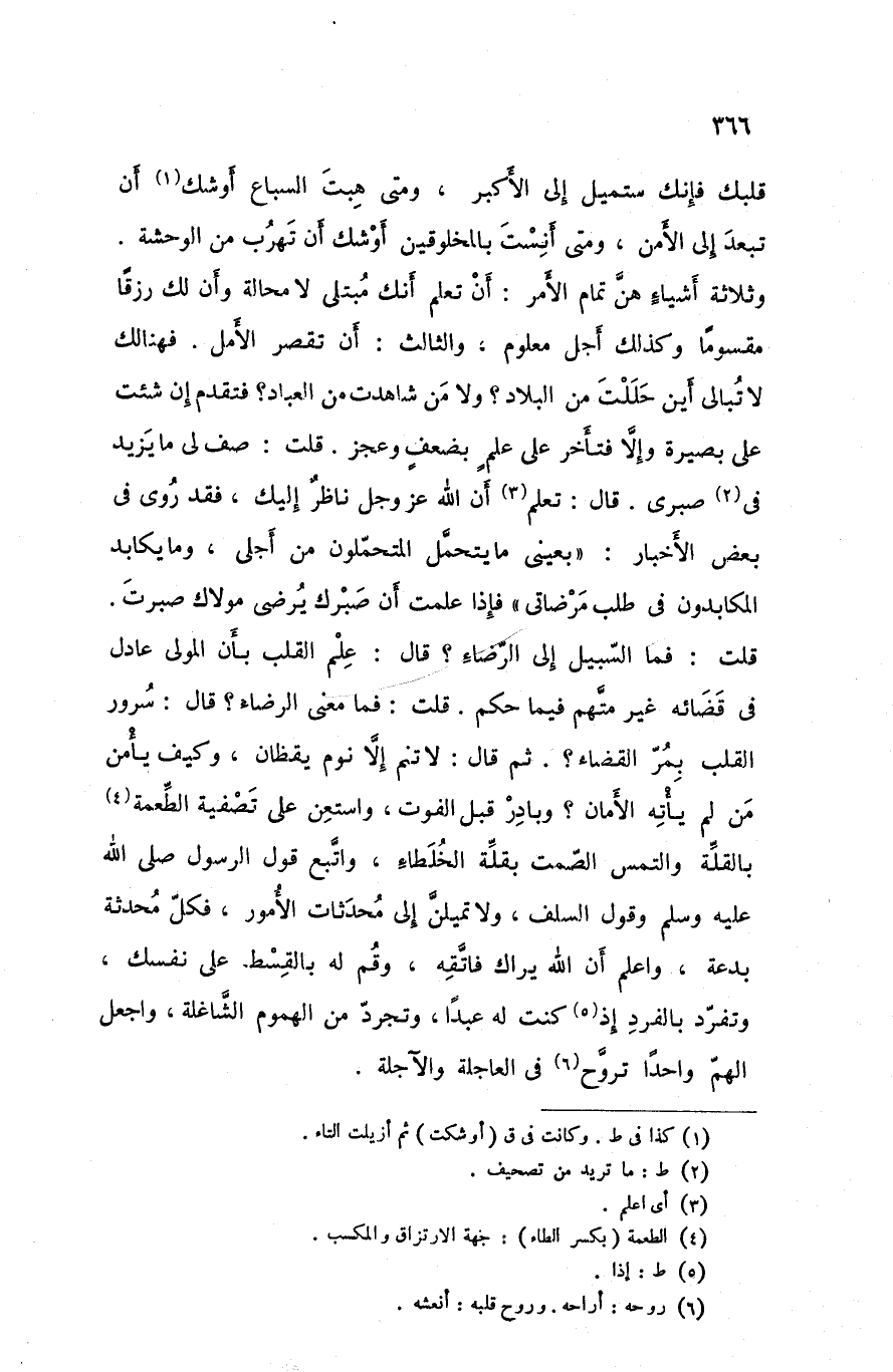 قلبك فإنك ستميل إلى الأكبر ومتى هبت السباع أوشك أن تبعد إلى الأمن ومتى أنست بالمخلوقين أوشك أن تهرب من الوحشة وثلاثة أشياء هن تمام الأمر أن تعلم أنك مبتلى لا محالة وأن لك رزقا مقسوما وكذلك أجل معلوم والثالث أن تقصر الأمل فهنالك لا تبالي أين حللت من البلاد ولا من شاهدت من العباد فتقدم إن شئت على بصيرة وإلا فتأخر على علم بضعف وعجز قلت صف لي مايزيد في صبري قال تعلم أن الله عزوجل ناظر إليك فقد روي في بعض الأخبار بعيني ما يتحمل المتحملون من أجلي وما يكابد المكابدون في طلب مرضاتي فإذا علمت أن صبرك يرضي مولاك صبرت قلت فما السبيل إلى الرضاء قال علم القلب بأن المولى عادل في قضائه غير متهم فيما حكم قلت فما معنى الرضاء قال سرور القلب بمرالقضاء ثم قال لا تنم إلا نوم يقظان وكيف يأمن من لم يأته الأمان وبادر قبل الفوت واستعن على تصفية الطعمة بالقلة والتمس الصمت بقلة الخلطاء واتبع قول الرسول صلى الله عليه و سلم وقول السلف و لا تميلن إلى محدثات الأمور فكل محدثة بدعة واعلم أن الله يراك فاتقه وقم له بالقسط على نفسك وتفرد بالفرد إذ كنت له عبدا وتجرد من الهموم الشاغلة واجعل الهم واحدا تروح في العاجلة والآجلة