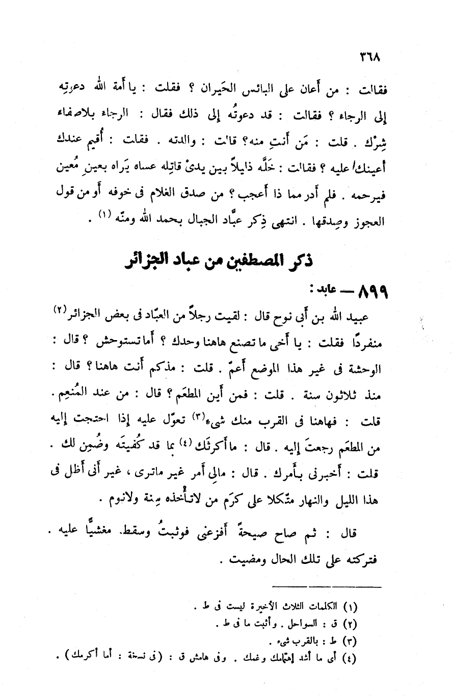 فقالت من أعان على البائس الحيران فقلت يا أمة الله دعوته إلى الرجاء فقالت قد دعوته إلى ذلك فقال الرجاء بلا صفاء شرك قلت من أنت منه قالت والدته فقلت أقيم عندك أعينك عليه فقالت خله ذليلا بين يدي قاتله عساه يراه بعين معين فيرحمه فلم أدر مما ذاأعجب من صدق الغلام في خوفه أو من قول العجوز وصدقها انتهى ذكر عباد الجبال بحمد الله ومنه