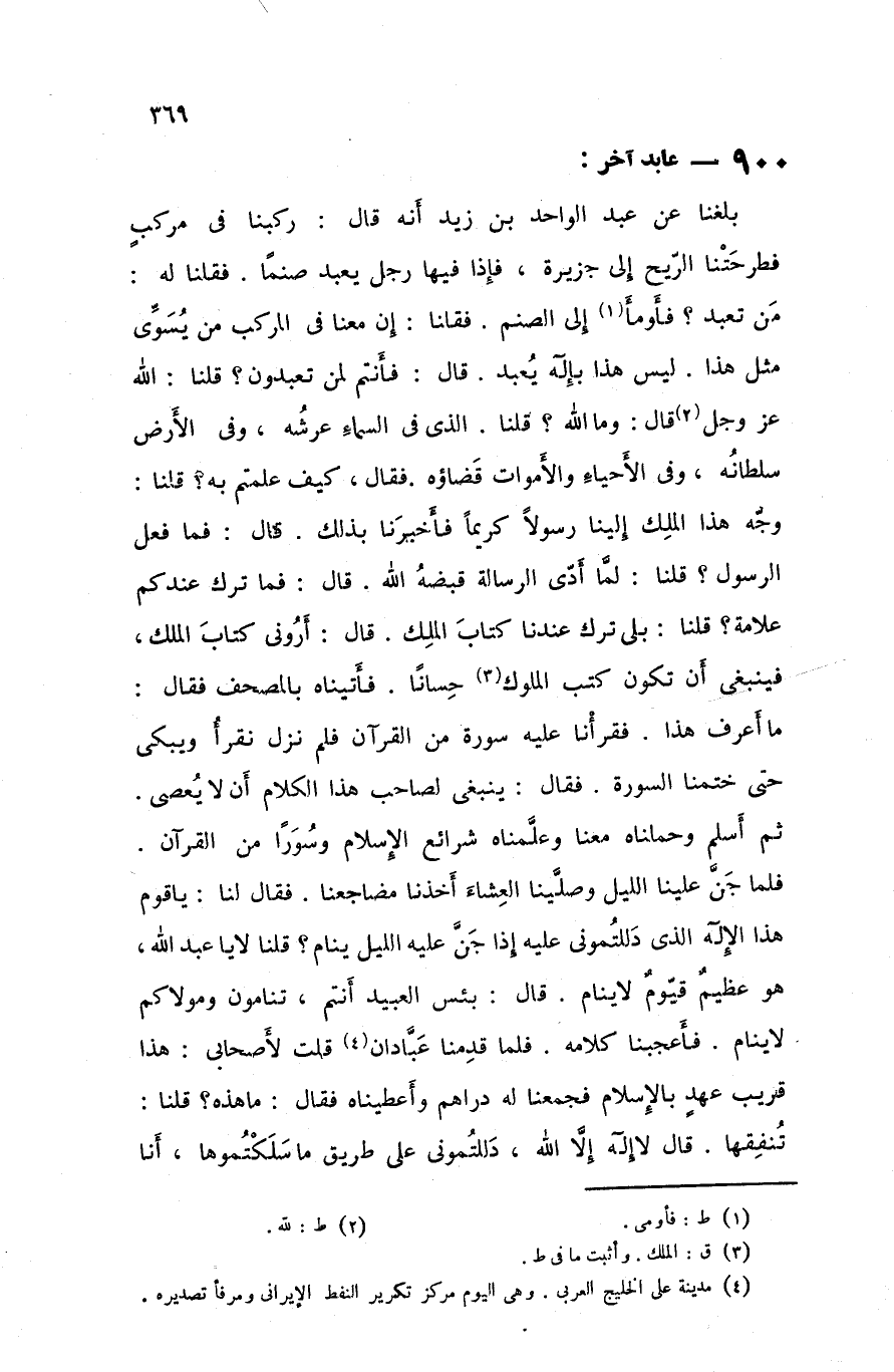 بلغنا عن عبد الواحد بن زيد أنه قال ركبنا في مركب فطرحتنا الريح إلى جزيرة فإذا فيها رجل يعبد صنما فقلنا له من تعبد فأومأ إلى الصنم فقلنا إن معنا في المركب من يسوى مثل هذا ليس هذا بإله يعبد قال فأنتم لمن تعبدون قلنا الله عز و جل قال وما الله قلنا الذي فى السماء عرشه وفي الأرض سلطانه وفى الأحياء والأموات قضاؤه فقال كيف علمتم به قلنا وجه هذا الملك إلينا رسولا كريما فأخبرنا بذلك قال فما فعل الرسول قلنا لما أدى الرساله قبضه الله قال فما ترك عندكم علامه قلنا بلى ترك عندنا كتاب الملك قال أرونى كتاب الملك فينبغى أن تكون كتب الملوك حسانا فأتيناه بالمصحف فقال ما أعرف هذا فقرأنا عليه سورة من القرآن فلم نزل نقرأ ويبكى حتى ختمنا السورة فقال ينبغى لصاحب هذا الكلام أن لايعصى ثم أسلم وحملناه معنا وعلمناه شرائع الاسلام وسورا من القرآن فلما جن علينا الليل وصلينا العشاء أخذنا مضاجعنا فقال لنا يا قوم هذا الإله الذى دللتمونى عليه إذا جن عليه الليل ينام قلنا لا يا عبد الله هو عظيم قيوم لا ينام قال بئس العبيد أنتم تنامون ومولاكم لاينام فأعجبنا كلامه فلما قدمنا عبادان قلت لأصحابى هذا قريب عهد بالإسلام فجمعنا له دراهم وأعطيناه فقال ما هذه قلنا تنفقها قال لاإله إلاالله دللتمونى على طريق ما سلكتموها أنا
