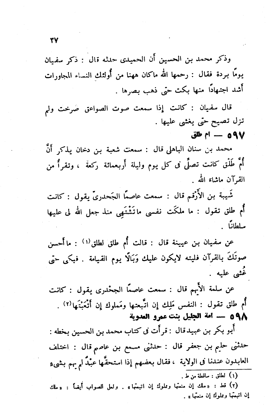 شيبة بن الأرقم قال سمعت عاصما الجحدري يقول كانت أم طلق تقول ما ملكت نفسي ما تشتهي منذ جعل الله لي عليها سلطانا
