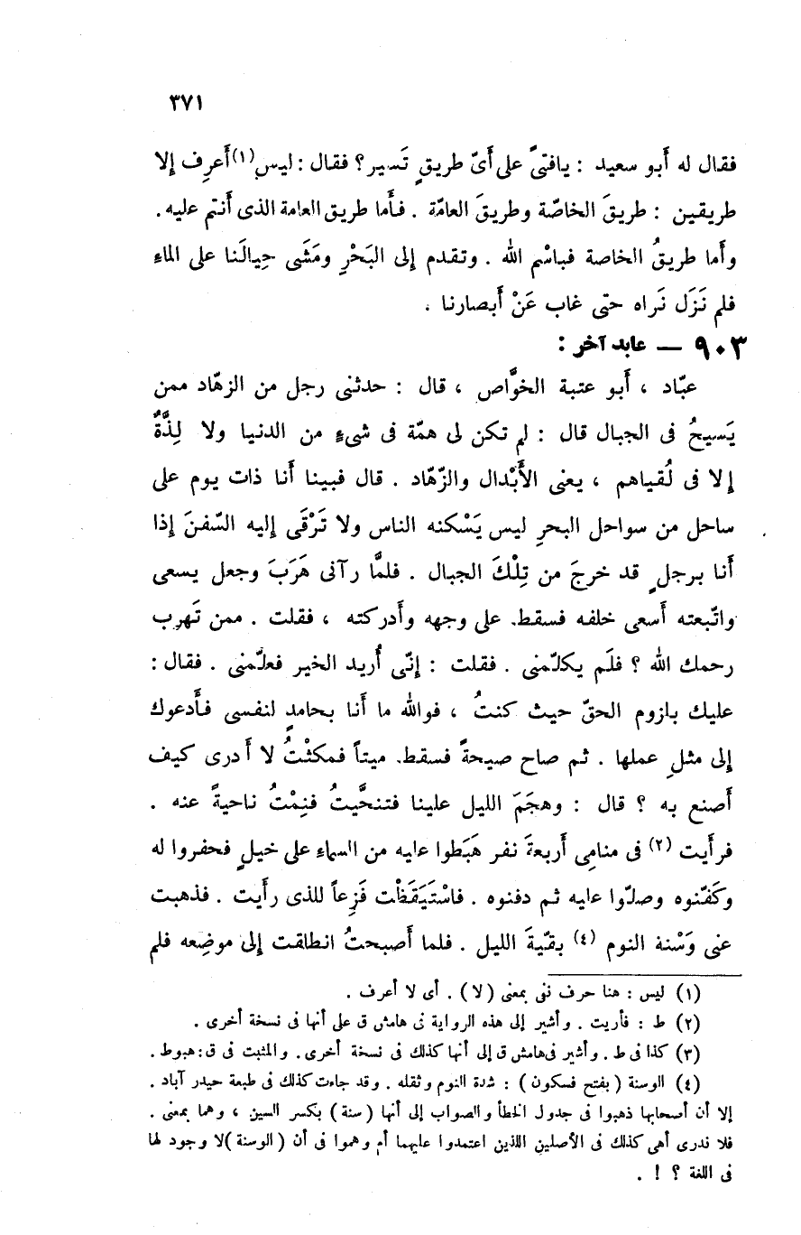 فقال له أبو سعيد يا فتى على أى طريق تسير فقال ليس أعرف إلا طريقين طريق الخاصه وطريق العامه فأما طريق العامه الذى أنتم عليه وأما طريق الخاصه فباسم الله وتقدم إلى البحر ومشى حيالنا على الماء فلم نزل نراه حتى غاب عن أبصارنا