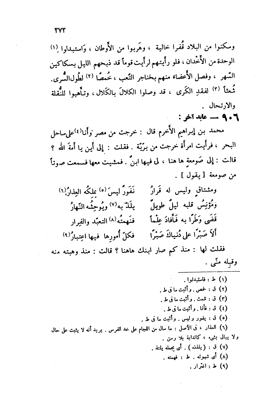وسكنوا من البلاد قفرا خاليه وهربوا من الاوطان واستبدلوا الوحده من الأخدان فلو رأيتهم لرأيت قوما قد ذبحهم الليل بسكاكين السهر وفصل الأعضاء منهم بخناجر التعب خمصا لطول السرى شعثا لفقد الكرى قد وصلوا الكلال بالكلال وتأهبوا للنقلة والارتحال