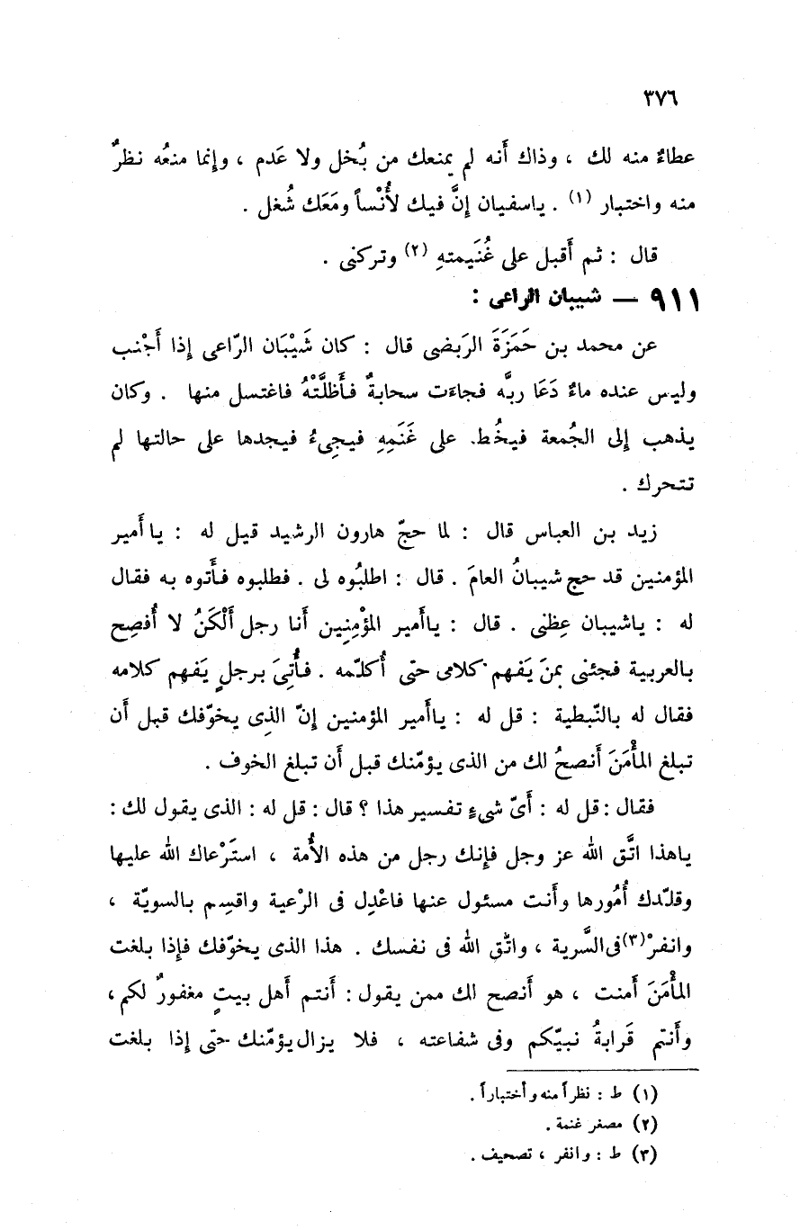 زيد بن العباس قال لما حج هارون الرشيد قيل له يا أمير المؤمنين قد حج شيبان العام قال اطلبوه لي فطلبوه فأتوه به فقال له يا شيبان عظني قال يا أمير المؤمنين أنا رجل ألكن لا أفصح بالعربية فجئني بمن يفهم كلامي حتى أكلمه فأتي برجل يفهم كلامه