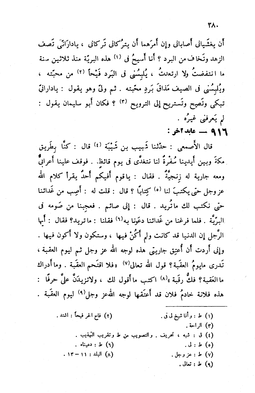 قال الأصمعي حدثنا شبيب بن شيبة قال كنا بطريق مكة و بين أيدينا سفرة نتغدى في يوم قائظ فوقف علينا أعرابي ومعه جارية له زنجية فقال يا قوم أفيكم أحد يقرأ كلام الله عزوجل حتى يكتب لنا كتابا قال قلت له أصب من غدائنا حتى نكتب لك ما تريد قال إني صائم فعجبنا من صومه في البرية فلما فرغنا من غدائنا دعونا به فقلنا ما تريد فقال أيها الرجل إن الدنيا قد كانت ولم أكن فيها و ستكون ولا أكون فيها وإني أردت أن أعتق جاريتي هذه لوجه عزوجل ثم ليوم العقبة تدري ما يوم العقبة قول الله تعالى فلا اقتحم العقبة وما أدراك ما العقبة فك رقبة اكتب ما أقول لك ولا تزيدن علي حرفا هذه فلانة خادم فلان قد أعتقها لوجه الله عزوجل ليوم العقبة