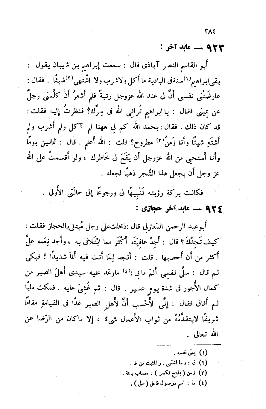 أبو عبد الرحمن المغازلي قال دخلت على رجل مبتلى بالحجاز فقلت كيف تجدك قال أجد عافيته أكثر مما ابتلاني به وأجد نعمه علي أكثر من أن أحصيها قلت أتجد لما أنت فيه ألما شديدا فبكى ثم قال سلي نفسي ألم ما بي ما وعد عليه سيدي أهل الصبر من كمال الأجور في شدة يوم عسير قال ثم غشي عليه فمكث مليا ثم أفاق فقال إني لأحسب أن لأهل الصبر غدا في القيامة مقاما شريفا لا يتقدمه من ثواب الأعمال شيء إلا ما كان من الرضا عن الله تعالى
