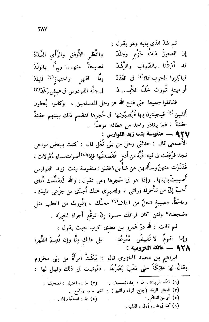 الأصمعي قال حدثني رجل من بني ثعل قال كنت ببعض نواحي نجد فرفعت لي فيه قبة من أدم فقصدتها فإذا أصوات نساء معولات فدنوت منهن وسألتهن عن شأنهن فقلن منفوسة بنت زيد الفوارس أصيبت بابنها وإذا هو في حجرها و هي تقول والله لتقدمك أمامي أحب إلي من تأخرك ورائي ولصبري عنك أجدى من جزعي عليك وما حظ مصيبة تحل من التلف محلك وتورث من العطب مثل مضجعك ولئن كان فراقك حسرة إن توقع أجرك لخيرة