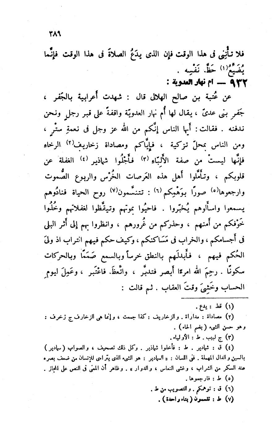 عن عتبة بن صالح الهلالي قال شهدت أعرابية بالجفر جفر بني عدي يقال لها أم نهار العدوية واقفة على قبر رجل ونحن ندفنه فقالت أيها الناس إنكم من الله عزوجل في نعمة ستر ومن الناس بمحل تزكية فإياكم ومصاداة زخاريف الرخاء فإنها ليست من صفة الأطباء فأجلوا شماذير الغفلة عن قلوبكم وتأملوا أهل هذه العرصات الخرس والربوع الصموت وارجعوها صورا بوهمكم تتنسمون روح الحياة فنادوهم يسمعوا واسألوهم يخبروا فاحيوا بموتهم وتيقظوا لغفلاتهم وخذوا خوفكم من أمنهم وحذركم من غرورهم وانظروا بهم إلى أثر البلى في أجسامكم والخراب في مساكنكم وكيف حكم فيهم التراب إذ ولي الحكم فيهم فأبدلهم بالنطق خرسا وبالسمع صمما وبالحركات سكونا رحم الله امرءا أبصر فتدبر واتعظ فاعتبر وعمل ليوم الحساب وخشي وقت العقاب ثم قالت
