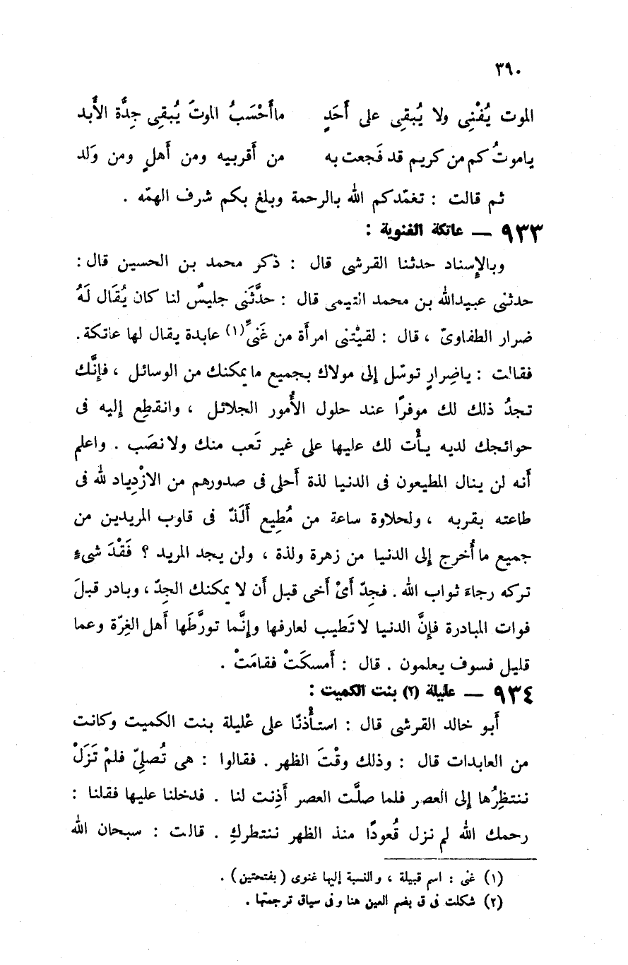 حدثني عبيد الله بن محمد التيمي قال حدثني جليس لنا كان يقال له ضرار الطفاوي قال لقيتني امرأة من غني عابدة يقال لها عاتكة فقالت يا ضرار توسل إلى مولاك بجميع ما يمكنك من الوسائل فإنك تجد ذلك لك موفرا عند حلول الأمور الجلائل وانقطع إليه في حوائجك لديه يأت لك عليها على غير تعب منك ولانصب واعلم أنه لن ينال المطيعون في الدنيا لذة أحلى في صدورهم من الازدياد لله في طاعته بقربه ولحلاوة ساعة من مطيع ألذ في قلوب المريدين من جميع ما أخرج إلى الدنيا من زهرة ولذة ولن يجد المريد فقد شيء تركه رجاء ثواب الله فنجد أي أخي قبل أن لا يمكنك الجد وبادر قبل فوات المبادرة فإن الدنيا لا تطيب لعارفها وإنما تورطها أهل الغرة و عما قليل فسوف يعلمون قال أمسكت فقامت
