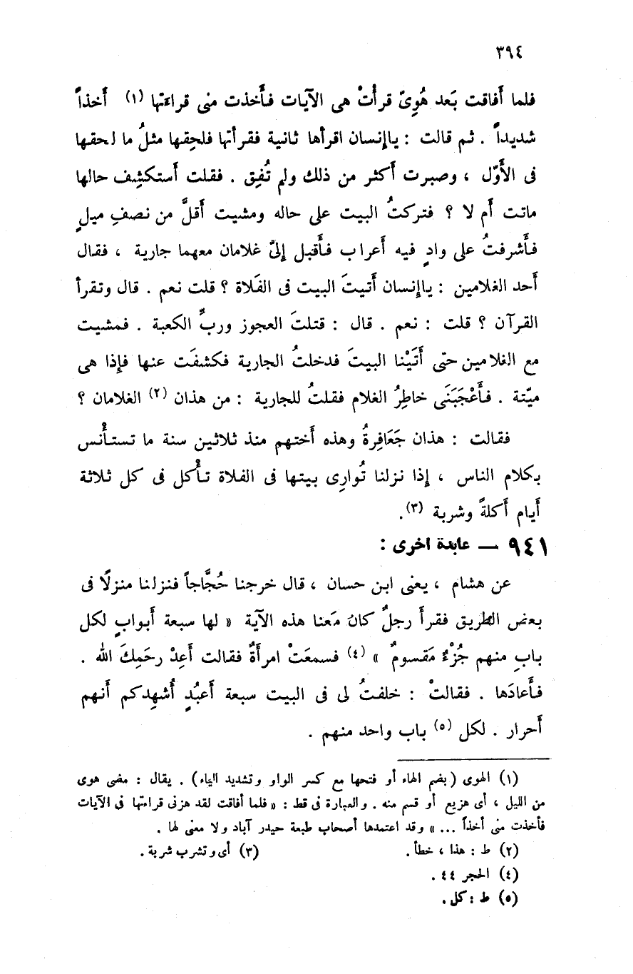 فلما أفاقت بعد هوي قرأت هي الآيات فأخذت مني قراءتها أخذا شديدا ثم قالت يا إنسان اقرأها ثانية فقرأتها فلحقها مثل ما لحقها في الأول و صبرت أكثر من ذلك ولم تفق فقلت أستكشف حالها ماتت أم لا فتركت البيت على حاله و مشيت أقل من نصف ميل فأشرفت على واد فيه أعراب فأقبل إلي غلامان معهما جارية فقال أحد الغلامين يا إنسان أتيت البيت في الفلاة قلت نعم قال و تقرأ القرآن قلت نعم قال قتلت العجوز ورب الكعبة فمشيت مع الغلامين حتى أتينا البيت فدخلت الجارية فكشفت عنها فإذا هي ميتة فأعجبني خاطر الغلام فقلت للجارية من هذان الغلامان