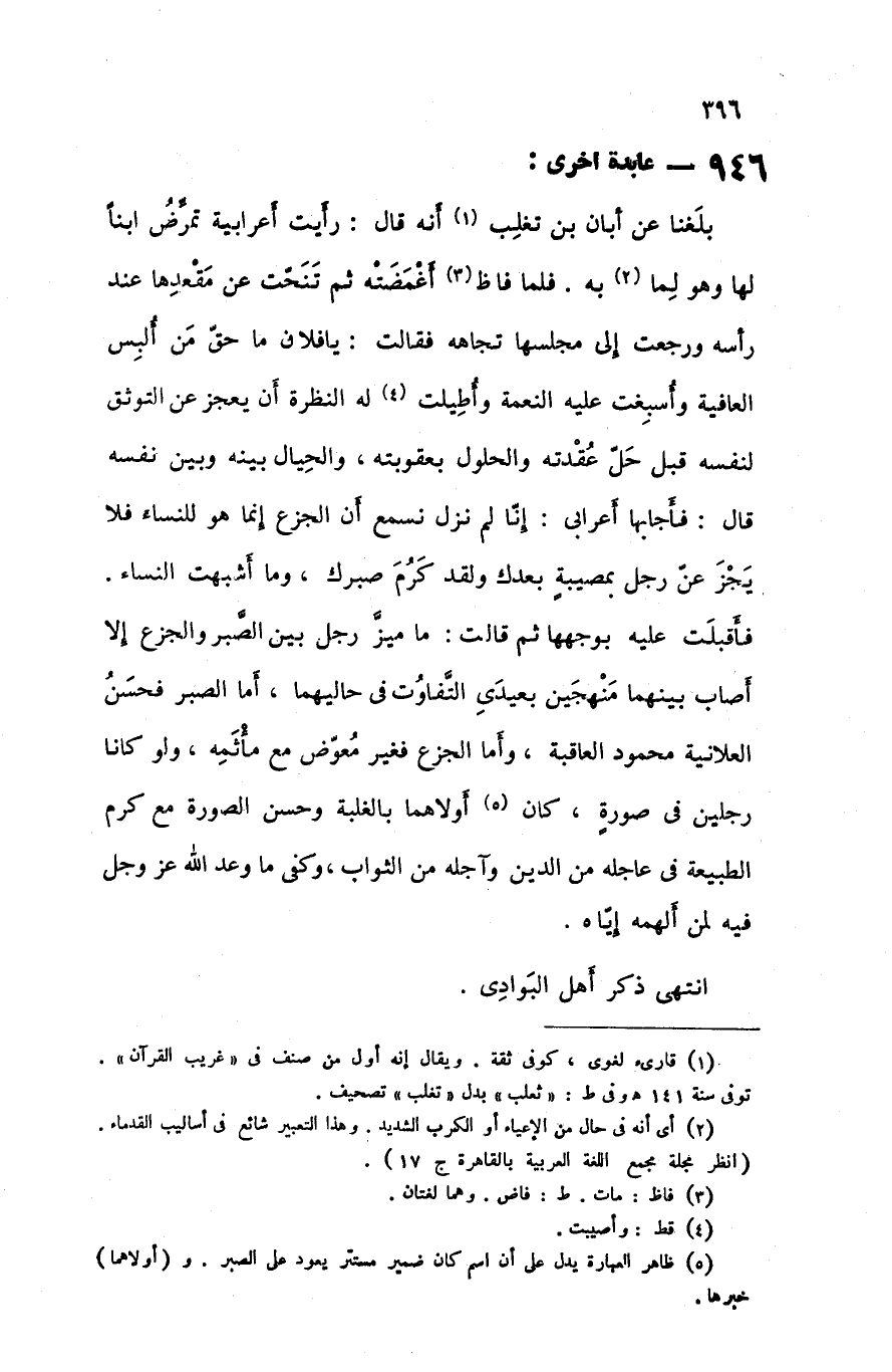 بلغنا عن أبان بن تغلب أنه قال رأيت أعرابية تمرض ابنا لها وهو لما به فلما فاظ أغمضته ثم تنحت عن مقعدها عند رأسه ورجعت إلى مجلسها تجاهه فقالت يا فلان ما حق من ألبس العافية وأسبغت عليه النعمة وأطيلت له النظرة أن يعجز عن التوثق لنفسه قبل حل عقدته والحلول بعقوبته والحيال بينه وبين نفسه قال فأجابها أعرابي إنا لم نزل نسمع أن الجزع إنما هو للنساء فلا يجز عن رجل بمصيبة بعدك ولقد كرم صبرك وما أشبهت النساء فأقبلت عليه بوجهها ثم قالت ما ميز رجل بين الصبر والجزع إلا أصاب بينهما منهجين بعيدي التفاوت في حاليهما أما الصبر فحسن العلانية محمود العاقبة وأما الجزع فغير معوض مع مأثمه ولو كانا رجلين في صورة كان أولادهما بالغلبة وحسن الصورة مع أكرم الطبيعة في عاجله من الدين وآجله من الثواب وكفى ما وعد الله عزوجل فيه لمن ألهمه إياه