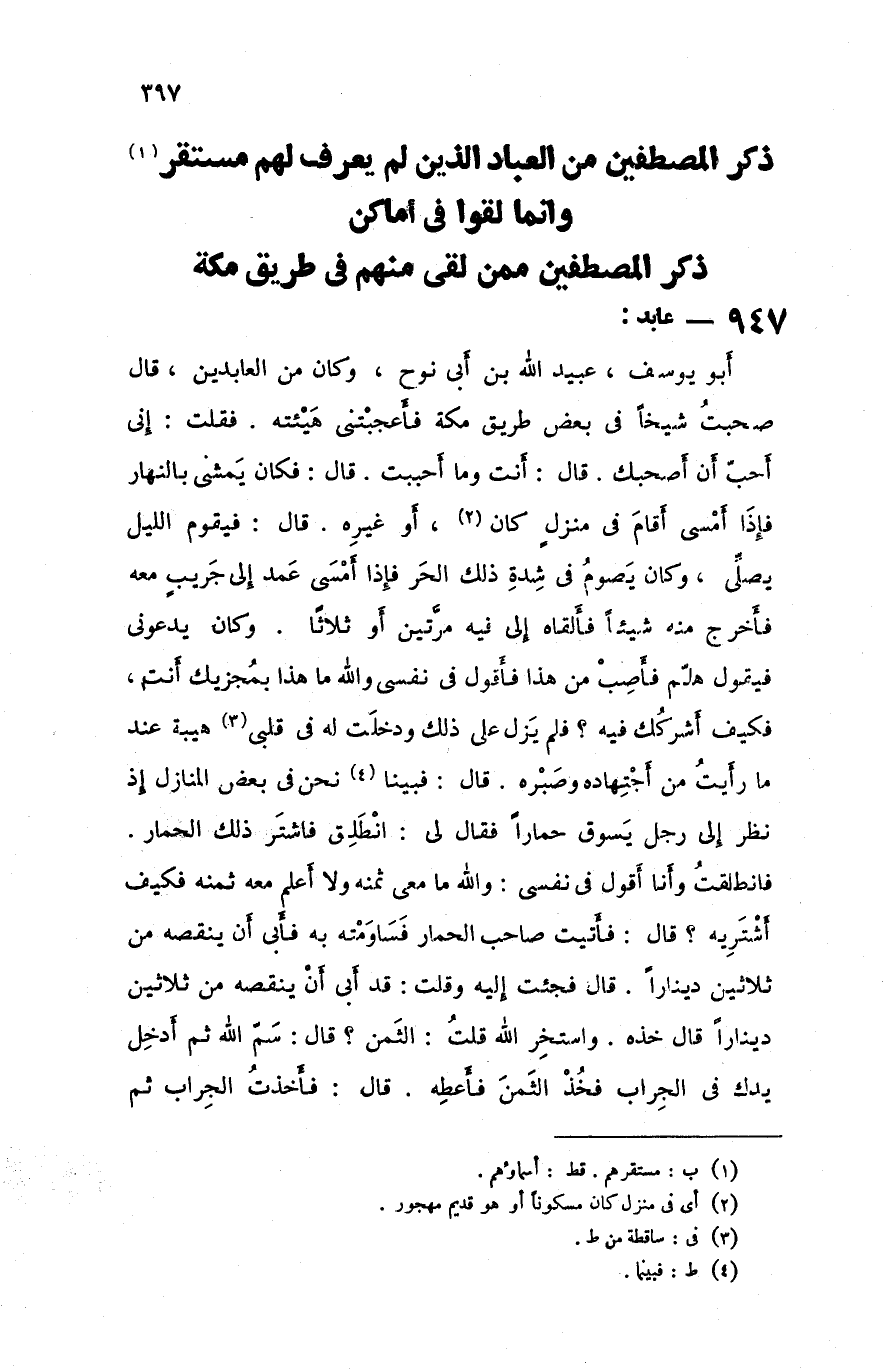 أبو يوسف عبيد الله بن أبي نوح وكان من العابدين قال صحبت شيخا في بعض طريق مكة فأعجبتني هيئته فقلت إني أحب أن أصحبك قال أنت وما أحببت قال فكان يمشي بالنهار فإذا أمسى أقام في منزل كان أو غيره قال فيقوم الليل يصلي وكان يصوم في شدة ذلك الحر فإذا أمسى عمد إلى جريب معه فأخرجمنه شيئا فألقاه إلى فيه مرتين أو ثلاثا وكان يدعونى فيقول هلم فأصب من هذا فالقول في نفسي والله ما هذا بمجزيك أنت فكيف أشركك فيه فلم يزل على ذلك ودخلت له في قلبي هيبة عند ما رأيت من اجتهاده وصبره قال فبينا نحن في بعض المنازل إذ نظر إلى رجل يسوق حمارا فقال لي انطلق فاشتر ذلك الحمار فانطلقت وأنا أقول في نفسي والله ما معي ثمنه ولا أعلم معه ثمنه فكيف أشتريه قال فأتيت صاحب الحمار فساومته به فأبى أن ينقصه من ثلاثين دينارا قال فجئت إليه وقلت قد أبي أن ينقصه من ثلاثين دينارا قال خذه واستخر الله قلت الثمن قال سم الله ثم أدخل يدك في الجراب فخذ الثمن فأعطه قال فأخذت الجراب ثم