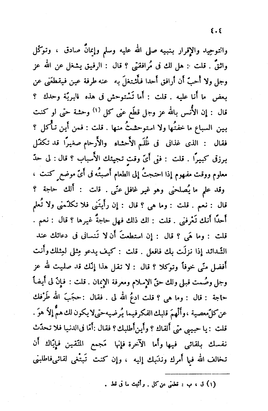 والتوحيد والاقرار بنبيه صلى الله عليه و سلم وإيمان صادق وتوكل واثق قلت هل لك فى مرافقتي قال الرفيق يشغل عن الله عز و جل ولا أحب أن أرفق أحدا فأشتغل به عنه طرفه عين فيقطعني عن بعض ما أنا عليه قلت أما تستوحش فى هذه البرية وحدك لو كنت قال إن الانس بالله عز و جل قطع عنى كل وحشه حتى بين السباع ماخفتها ولا استوحشت منها قلت فمن أين تأكل فقال الذى غذانى فى ظلم الاحشاء والارحام صغيرا قد تكفل برزقي كبيرا قلت ففى أى وقت تجيئك الاسباب قال لى حد معلوم ووقت مفهوم إذا احتجت إلى الطعام أصبته فى أى موضع كنت وقد علم ما يصلحنى وهو غير غافل عنى قلت ألك حاجه قال نعم قلت وما هى قال إن رأيتنى فلا تكلمنى ولا تعلم أحدا أنك تعرفنى قلت لك ذلك فهل حاجه غيرها قال نعم قلت وما هى قال إن استطعت أن لا تنسانى فى دعائك عند الشدائد إذا نزلت بك فافعل قلت كيف يدعو مثلى لمثلك وأنت أفضل منى خوفا وتوكلا قال لا تقل هذا إنك قد صليت لله عز و جل وصمت قبلى ولك حق الاسلام ومعرفة الايمان قلت فإن لى أيضا حاجة قال وما هى قلت ادع الله لى فقال حجب الله طرفك عن كل معصية وألهم قلبك الفكر فيما يرضيه حتى لا يكون لك هم إلا هو قلت يا حبيبى متى ألقاك وأين أطلبك فقال أما فى الدنيا فلا تحدث نفسك بلقائى فيها وأما الآخرة فإنها مجمع المتقين فإياك أن تخالف الله فيما وندبك إليه وأن كنت تبتغى لقائى فاطلبني