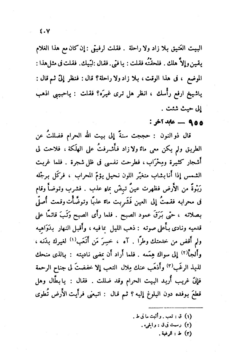 قال ذو النون حججت سنة إلى بيت الله الحرام فضللت عن الطريق ولم يكن معى ماء ولا زاد فأشرفت على الهلكة فلاحت لى أشجار كثيرة ومحراب فطرحت نفسى فى ظل شجرة فلما غربت الشمس إذا أنا بشاب متغير اللون نحيل يؤم المحراب فركل برجله ربوة من الارض فظهرت عين تبض بماء عذب فشرب وتوضأ وقام فى محرابة فقمت إلى العين فشربت ماء عذبا وتوضأت وقمت أصلى بصلاته حتى برق عمود الصبح فلما رأى الصبح وثب قائما على قدميه ونادى بأعلى صوته ذهب الليل بما فيه وأقبل النهار بدواهيه ولم أقض من خدمتك وطرا آة خسر من أتعب لغيرك بدنه وألجا إلى سواك هممه فلما أراد أن يمضى ناديته بالذى منحك لذيذ الرغب وأذهب عنك ملال التعب إلا خفضت لى جناح الرحمه فإنى غريب أريد البيت الحرام وقد ضللت فقال يا بطال وهل قطع بوفده دون البلوغ إليه ثم قال اتبعنى فرأيت الارض تطوى