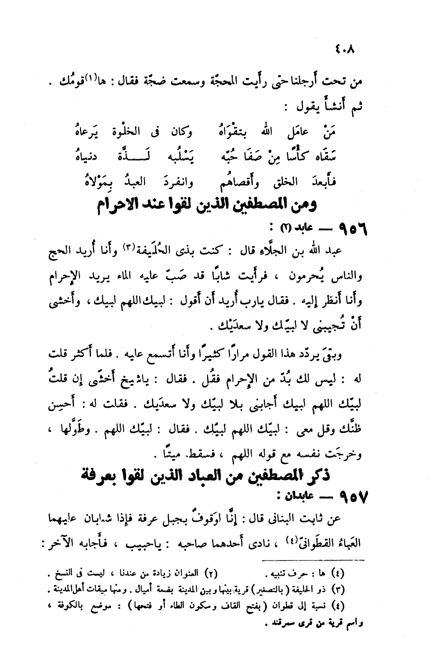 عن ثابت البنانى قال إنا لوقوف بجبل عرفة فإذا شابان عليهما العباء القطوانى نادى أحدهما صاحبه يا حبيب فأجابه الآخر