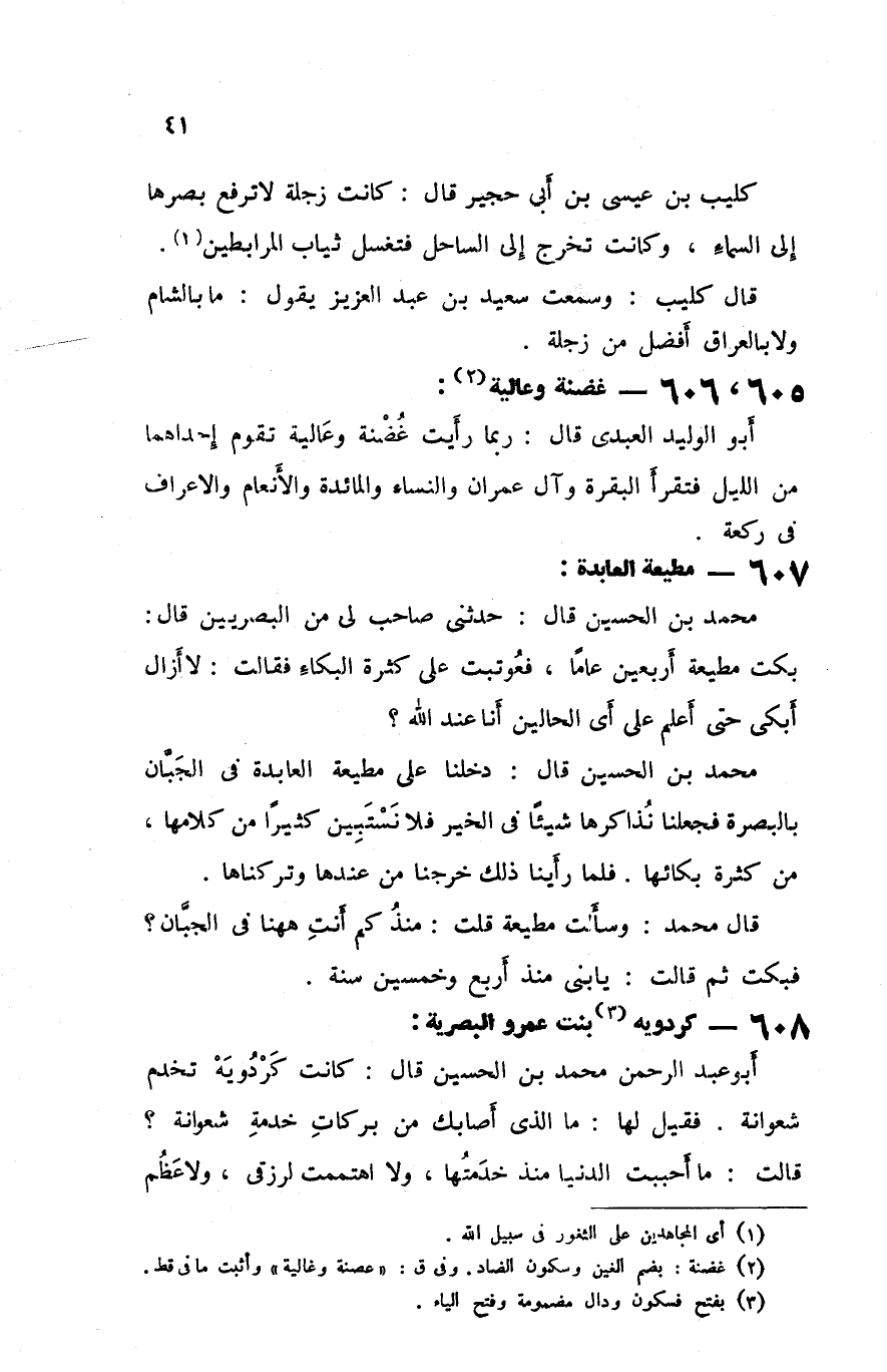 ابو الوليد العبدي قال ربما رأيت غضنة وعالية تقوم إحداهما من الليل فتقرأ البقرة وآل عمران والنساء والمائدة والأنعام والأعراف في ركعة