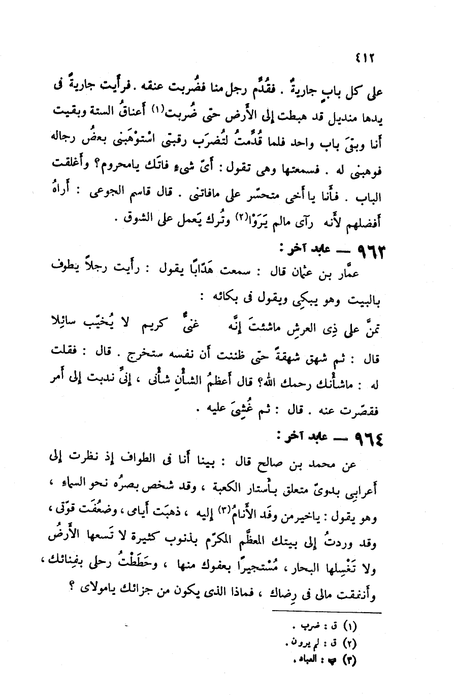 عن محمد بن صالح قال بينا أنا في الطواف إذ نظرت إلى اعرابي بدوي متعلق بأستار الكعبة وقد شخص بصره نحو السماء وهو يقول يا خير من وفد الأنام إليه ذهبت أيامي وضعفت قوتي وقد وردت إلى بيتك المعظم المكرم بذنوب كثيرة لا تسعها الأرض ولا تغسلها البحار مستجيرا بعفوك منها وحططت رحلى بفنائك وأنفقت مالي في رضاك فماذا الذي يكون من جزائك يا مولاي