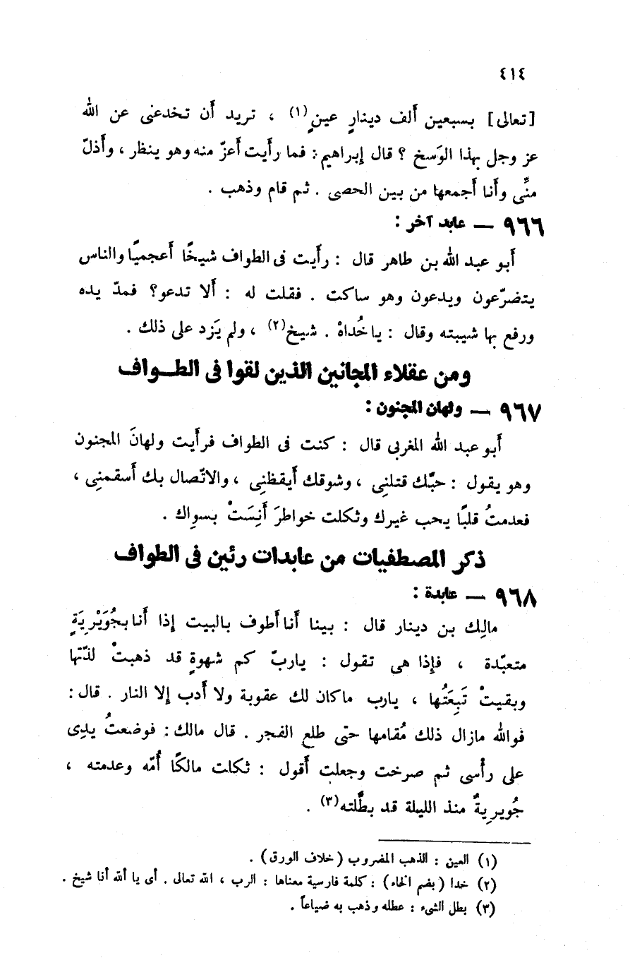 أبو عبدالله بن طاهر قال رأيت في الطواف شيخا أعجميا والناس يتضرعون ويدعون وهو ساكت فقلت له ألا تدعو فمد يده ورفع بها شيبته وقال يا خداه شيخ ولم يزد على ذلك ومن عقلاء المجانين الذين لقوا في الطواف