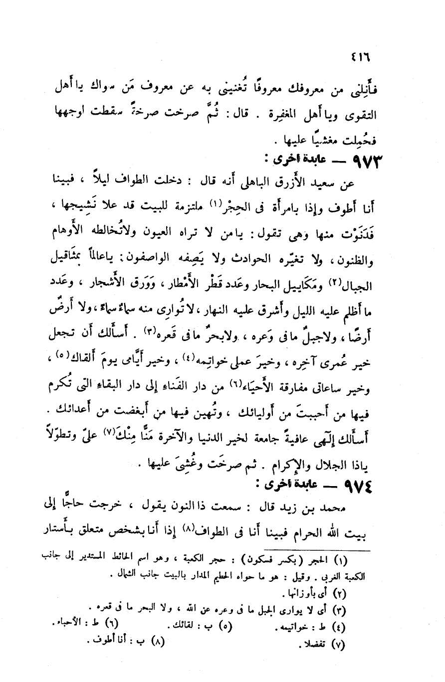 عن سعيد الأزرق الباهلي أنه قال دخلت الطواف ليلا فبينا أنا أطوف وإذا بأمرأة في الحجر ملتزمة للبيت قد علا نشيجها فدنوت منها وهي تقول يا من لا تراه العيون ولا تخالطه الأوهام والظنون ولا تغيره الحوادث ولا يصفه الواصفون يا عالما بمثاقيل الجبال ومكاييل البحار وعدد قطر الأمطار وورق الأشجار وعدد ما أظلم عليه الليل واشرق عليه النهار لا تواري منه سماء سماء ولا ارض أرضا ولا جبل ما في وعره ولا بحر ما في قعره اسألك أن تجعل خير عمرى آخره وخير علمي خواتمه وخير أيامي يوم ألقاك وخير ساعاتي مفارقه الأحياء من دار الغناء إلى دار البقاء التي تكرم فيها من أحببت من أوليائك وتهين فيها من أبغضت من أعدائك أسألك إليهي عافية جامعة لخير الدنيا والآخرى منا منك على وتطولا يا ذا الجلال والإكرام ثم صرخت وغشي عليها