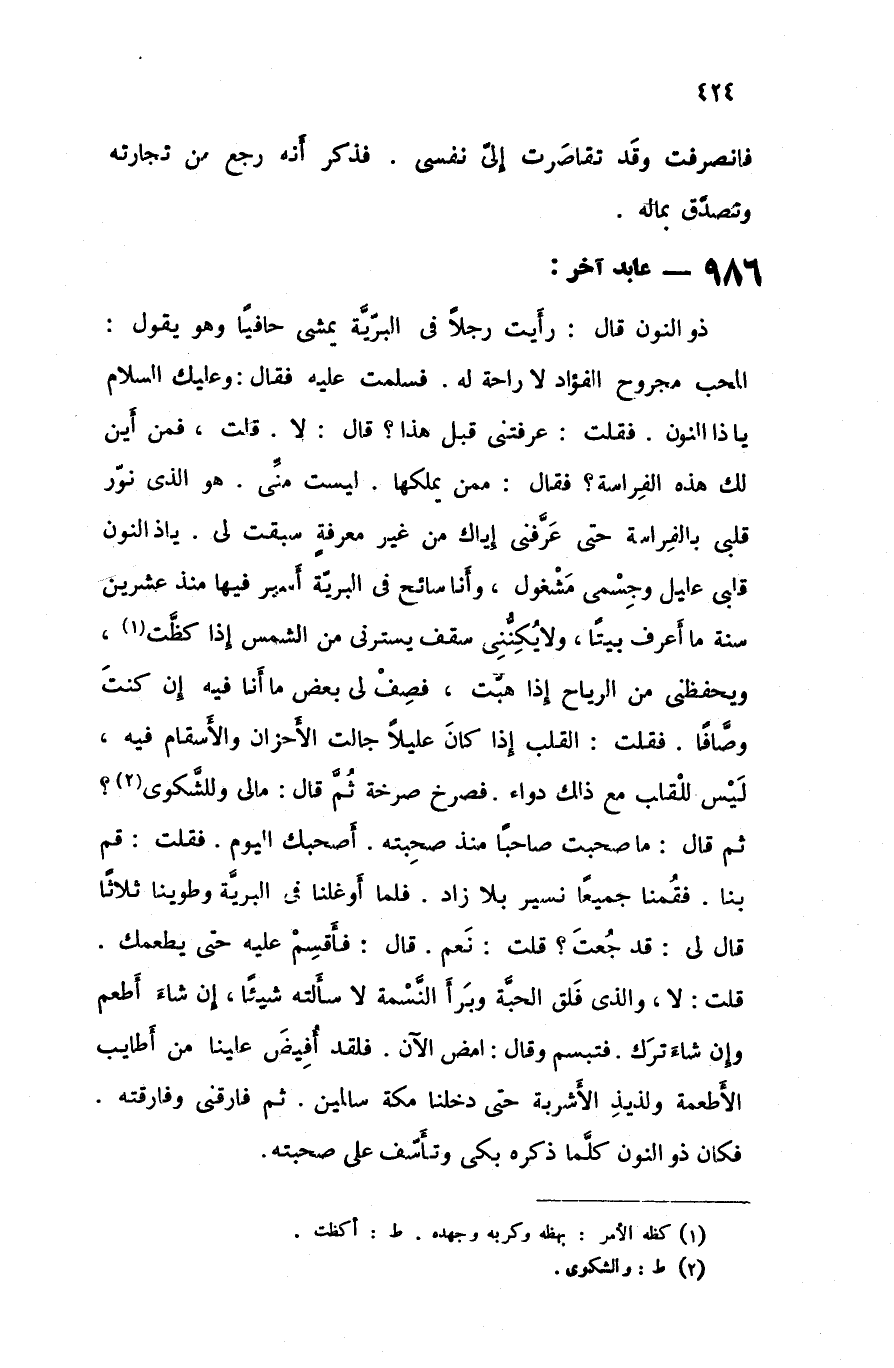 ذو النون قال رايت رجلا في البرية يمشى حافيا وهو يقول المحب مجروح الفؤاد ولا راحة له فسلمت عليه فقال وعليك السلام يا ذا النون فقلت عرفتني قبل هذا قال لا قلت فمن أين لك هذه الفراسة فقال ممن يمكلها ليست مني هو الذي نور قلبي بالفراسة حتى عرفني إياك من غير معرفة سبقت لي يا ذا النون قلبي عليل وجسمي مشغول وأنا سائح في البرية أسير فيها منذ عشرين سنة ما أعرف بيتا ولا يكنني سقف يسترني من الشمس إذا كظت ويحفظني من الرياح إذا هبت فصف لي بعض ما أنا فيه إن كنت وصافا فقلت القلب إذا كان عليلا جالت الأحزان والاسام فيه ليس للقلب مع ذلك دواء فصرخ صرخة ثم قال مالي وللشكوى ثم قال ما صحبت صاحبا منذ صحبته أصحبك اليوم فقلت قم بنا فقمنا جميعا نسير بلا زاد فلما أوغلنا في البرية وطوينا ثلاثا قال لي قد جعت قلت نعم قال فأقسم عليه حتى يطعمك قلت لا والذي فلق الحبة وبرأ النسمة لا سالته شيئا إن شاء اطعم وإن شاء ترك فتبسم وقال امض الآن فلقد أفيض علينا من أطايب الأطعمة ولذيذ الأشربة حتى دخلنا مكة سالمين ثم فارقني وفارقته فكان ذو النون كلما ذكره بكى وتأسف على صحبته